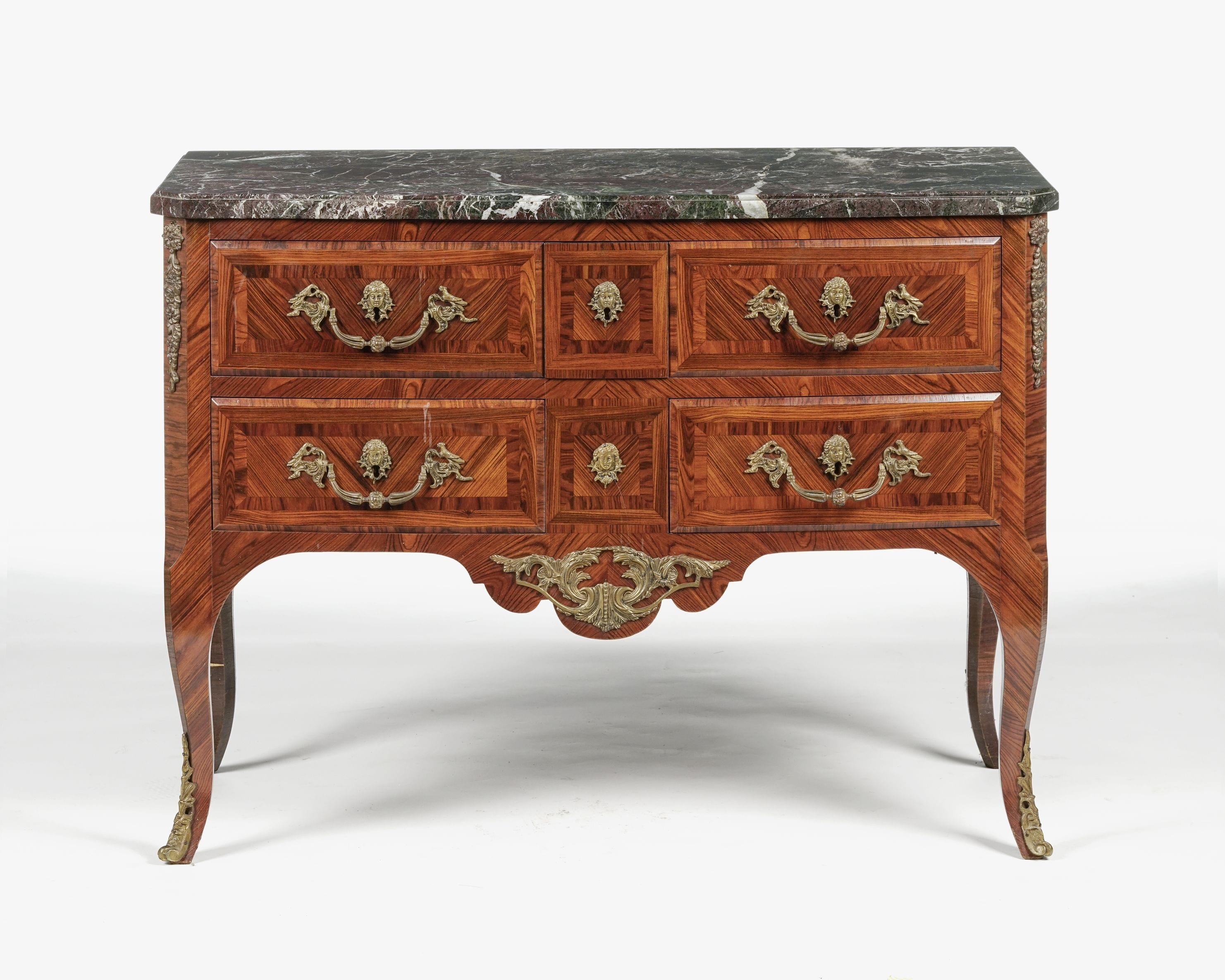 Cinq tiroirs, bois de placage et marbre veiné gris, bronze, 82x115x50 cm