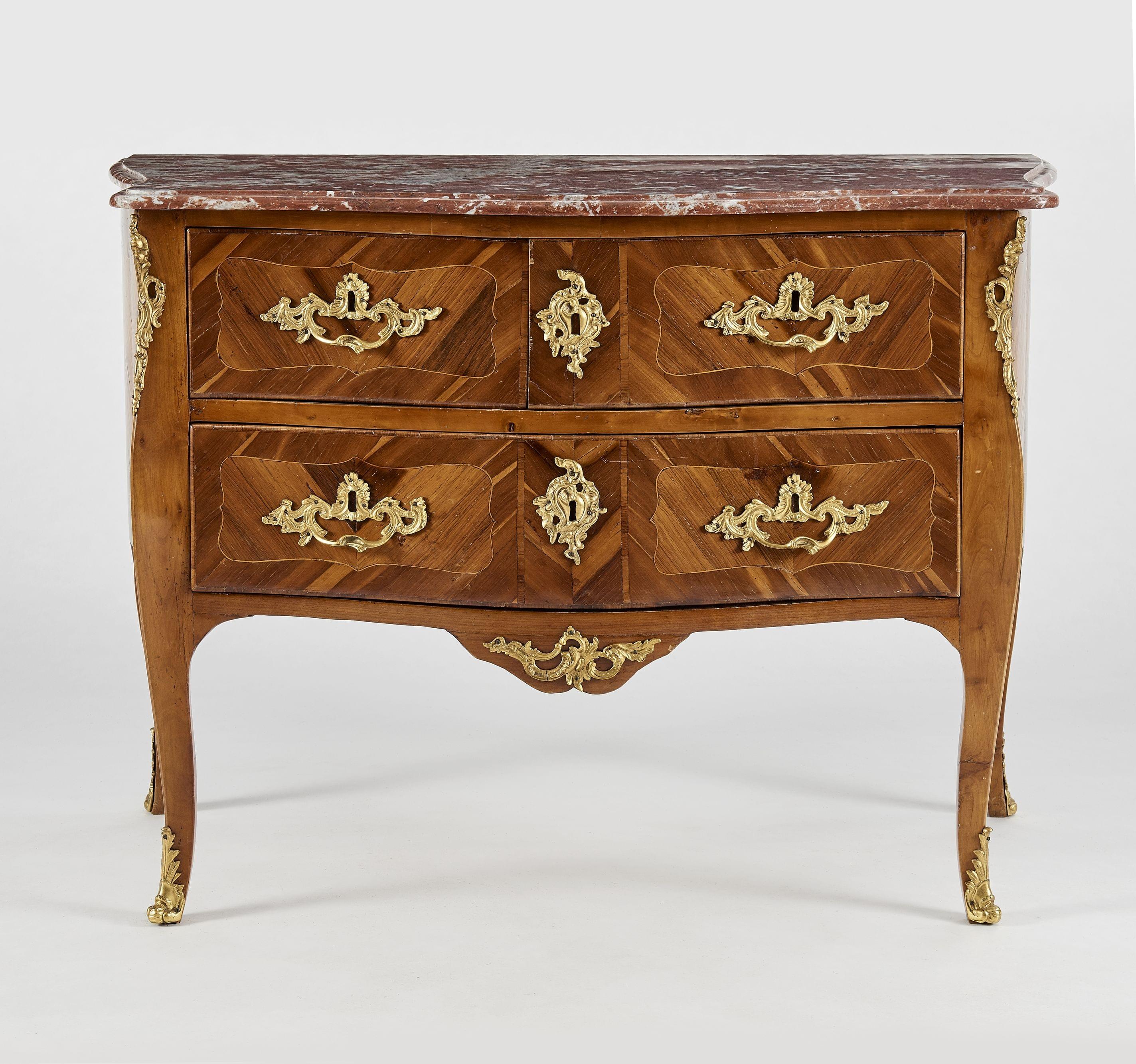 Trois tiroirs sur deux rangs, bois de placage et marbre veiné rouge, bronze doré, 80x109x56 cm. Provenance: collection Pernet-Villaverde