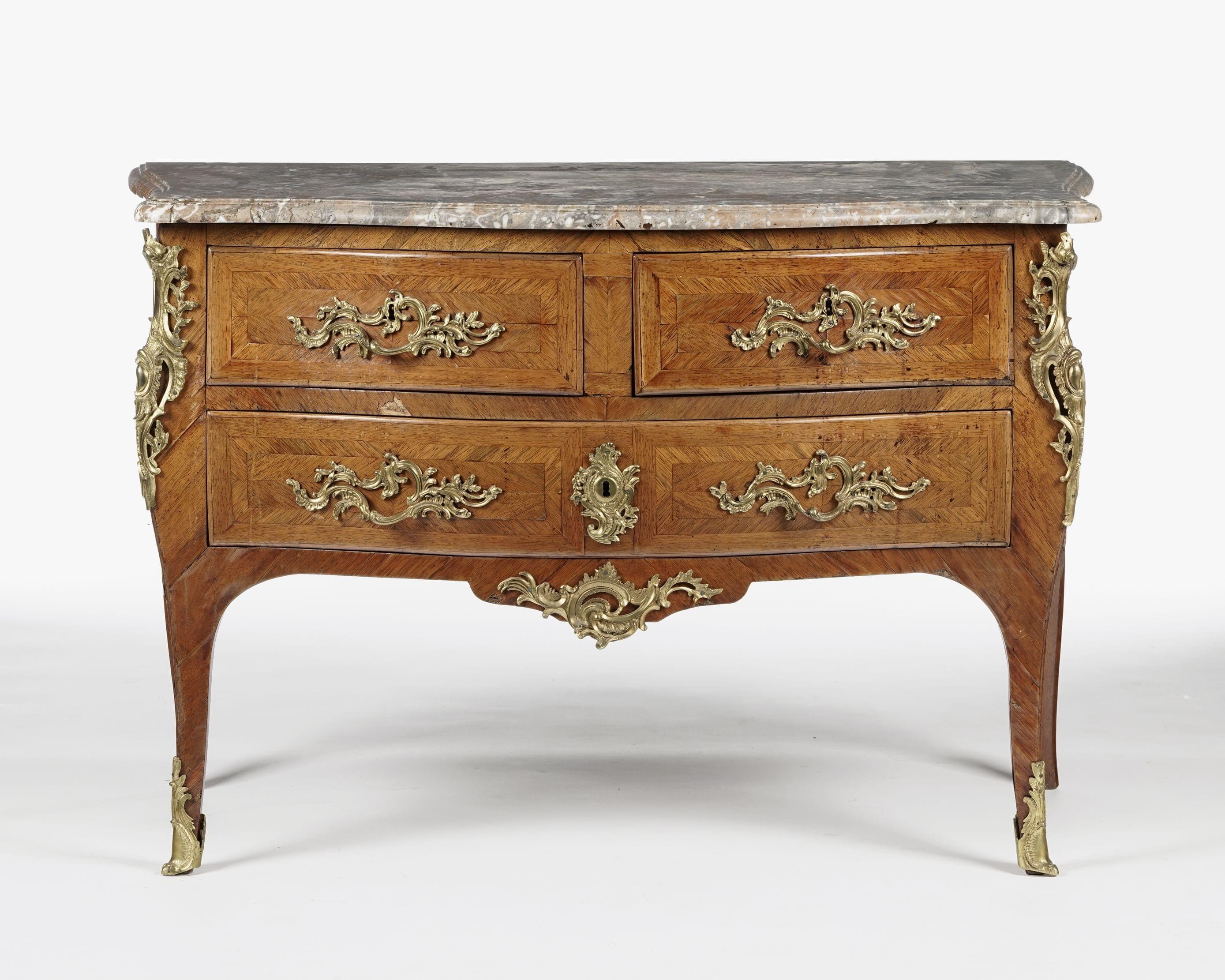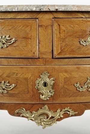 Trois tiroirs sur deux rangs, bois de placage, bronze doré et marbre, 86x130x67 cm. Antoine-Mathieu Criard, reçu maître en 1747