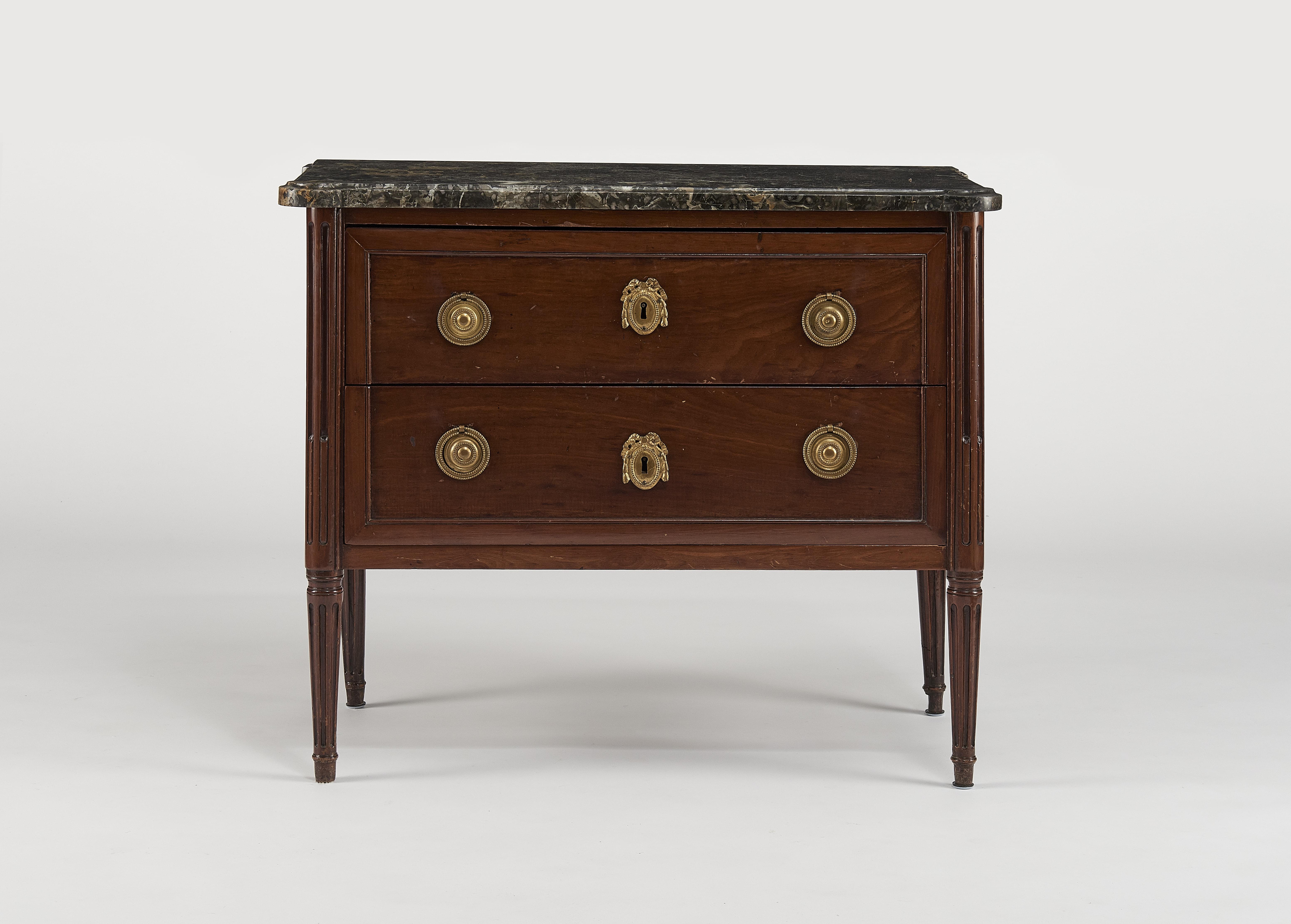 Deux tiroirs, marbre gris, acajou, 71x80x43 cm