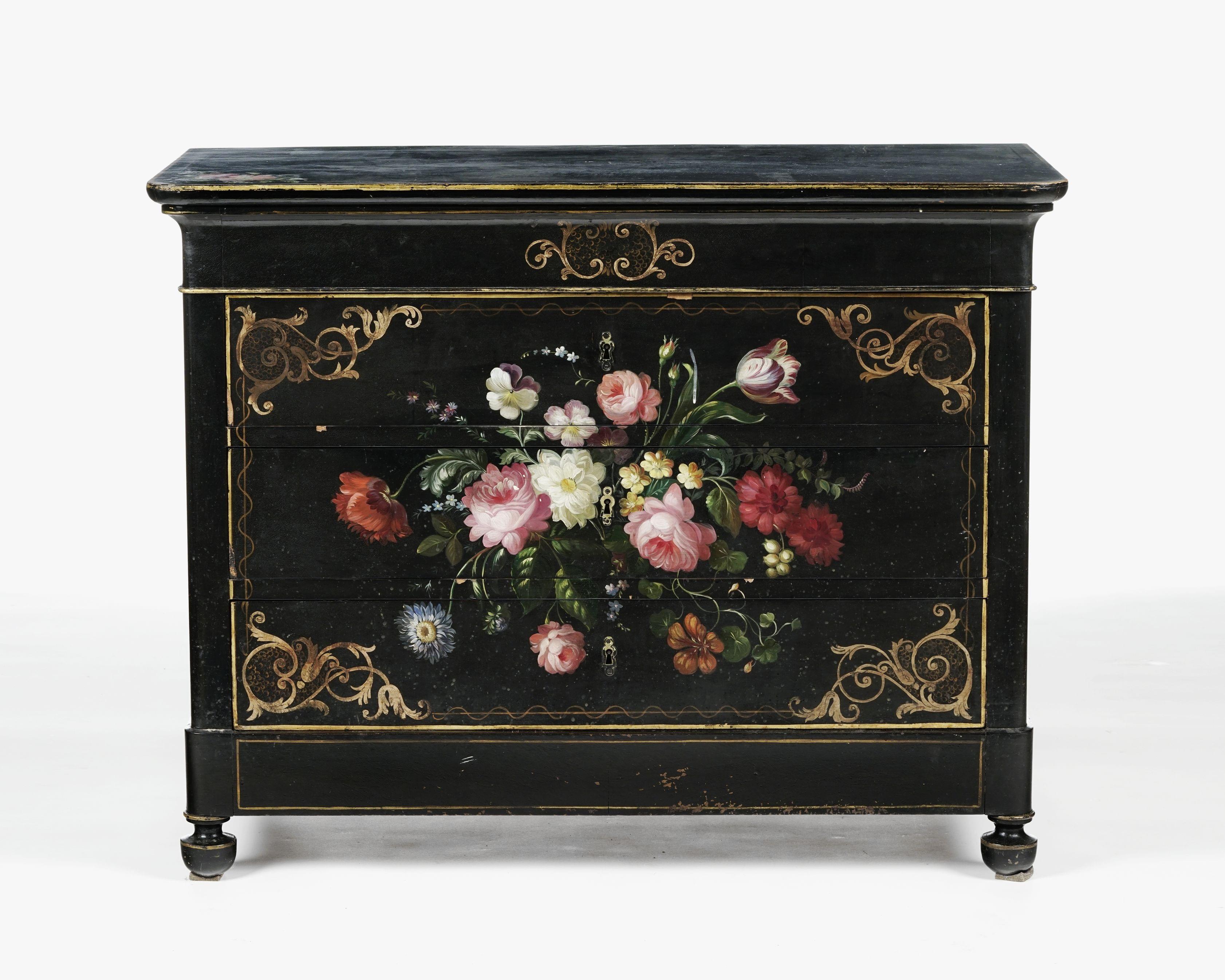 Bois laqué noir à décor peint de fleurs, quatre tiroirs, 90x115x56 cm