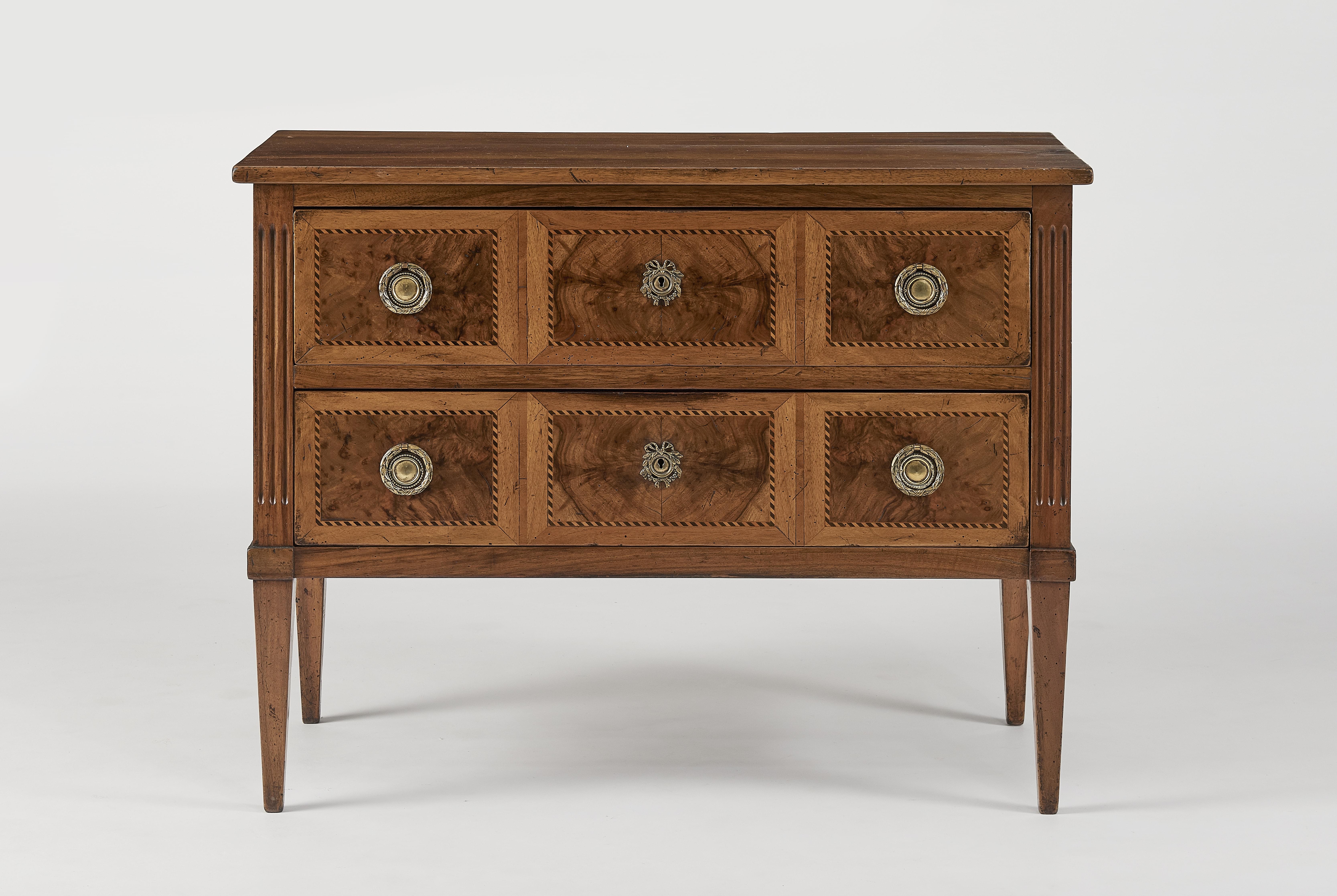 Deux tiroirs, placage de bois fruitier marqueté en filets, 83x95x46 cm