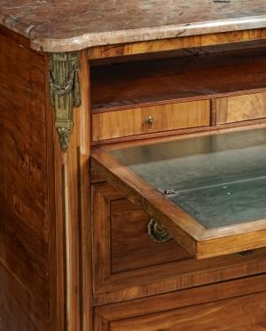 Acajou et filets d'encadrement, un abattant démasquant tiroirs et casiers, deux tiroirs, plateau de marbre, 89x80x45 cm
