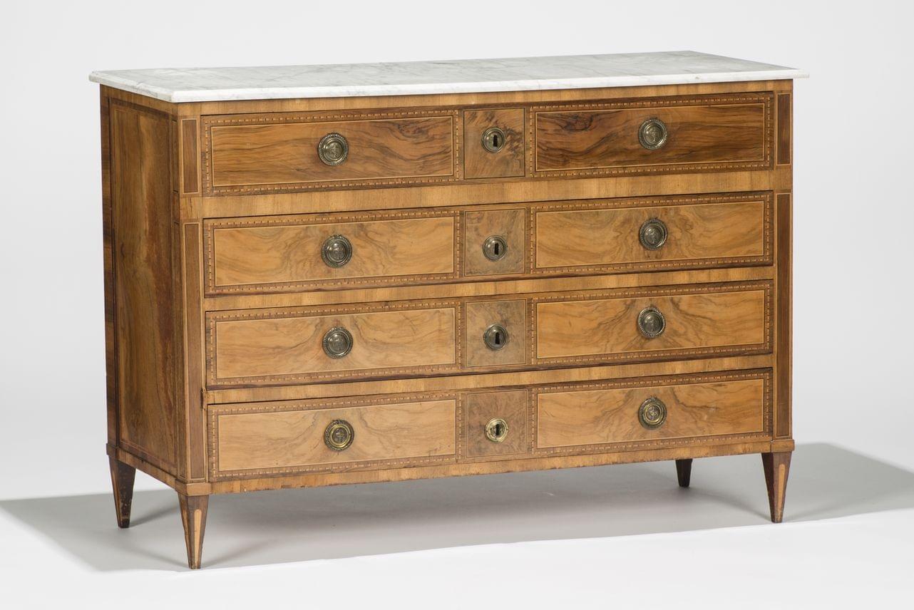 Bois fruitier marqueté en filets, quatre tiroirs, dessus de marbre blanc, 93x133x48 cm