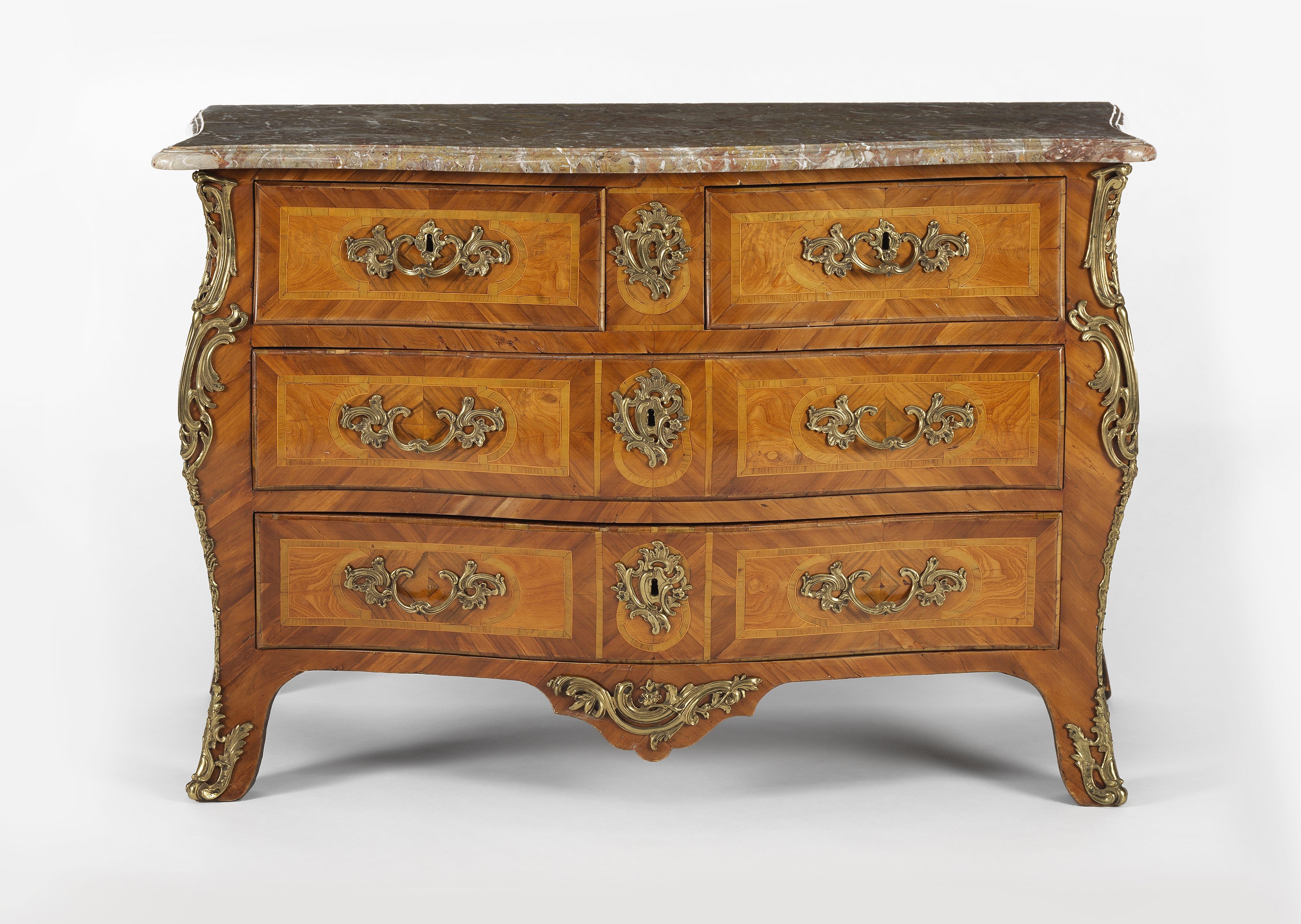 Cinq tiroirs, placage de bois de rose et bois de violette marqueté dans des entourages de filets, bronzes dorés, marbre rose, 96x138x70 cm
