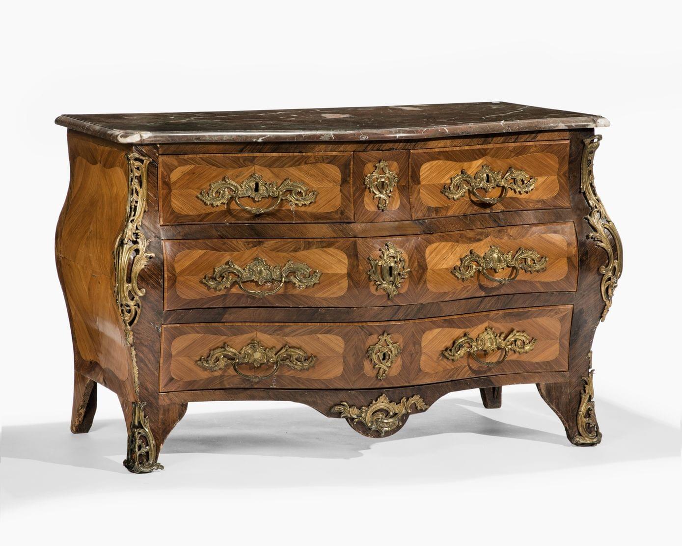 Bois de rose et bois de violette marquetés en feuilles dans des encadrements de filets, bronze doré, marbre brèche, estampille illisible, 85x131x65 cm