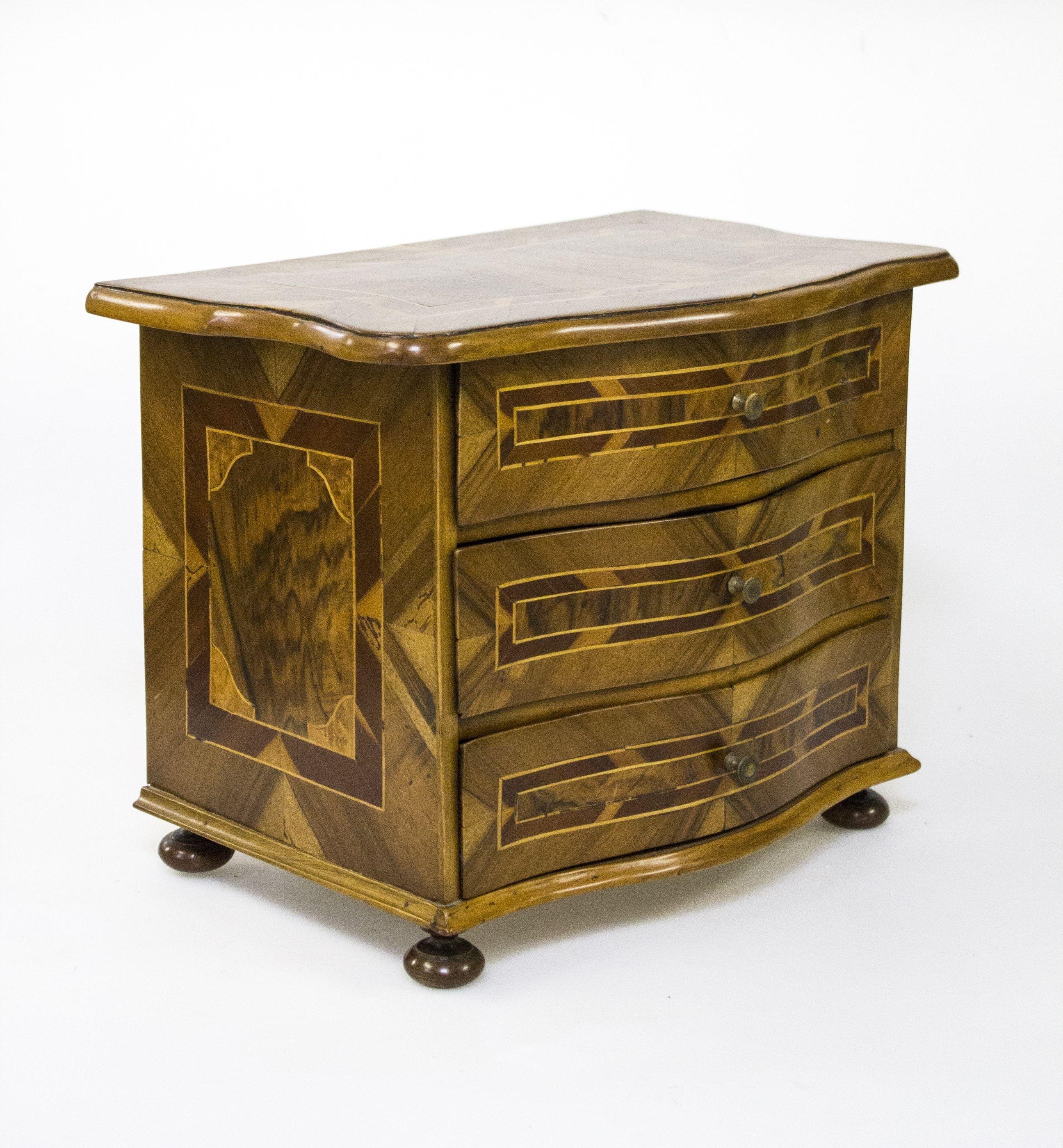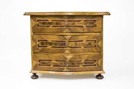 Trois tiroirs, placage de bois fruitier marqueté dans des encadr...