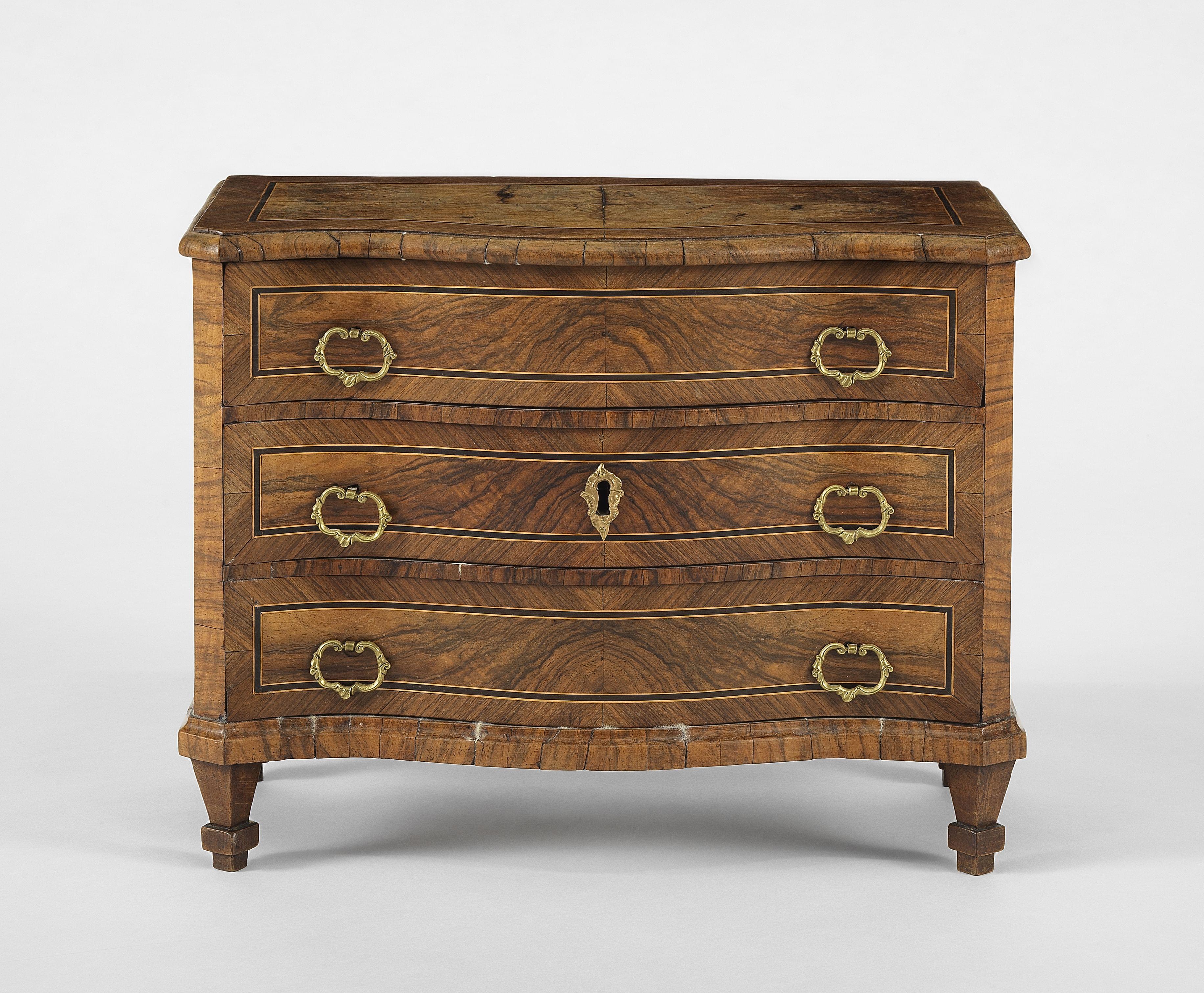 Trois tiroirs, noyer et filets de bois noirci, laiton, 35x45x24 cm
