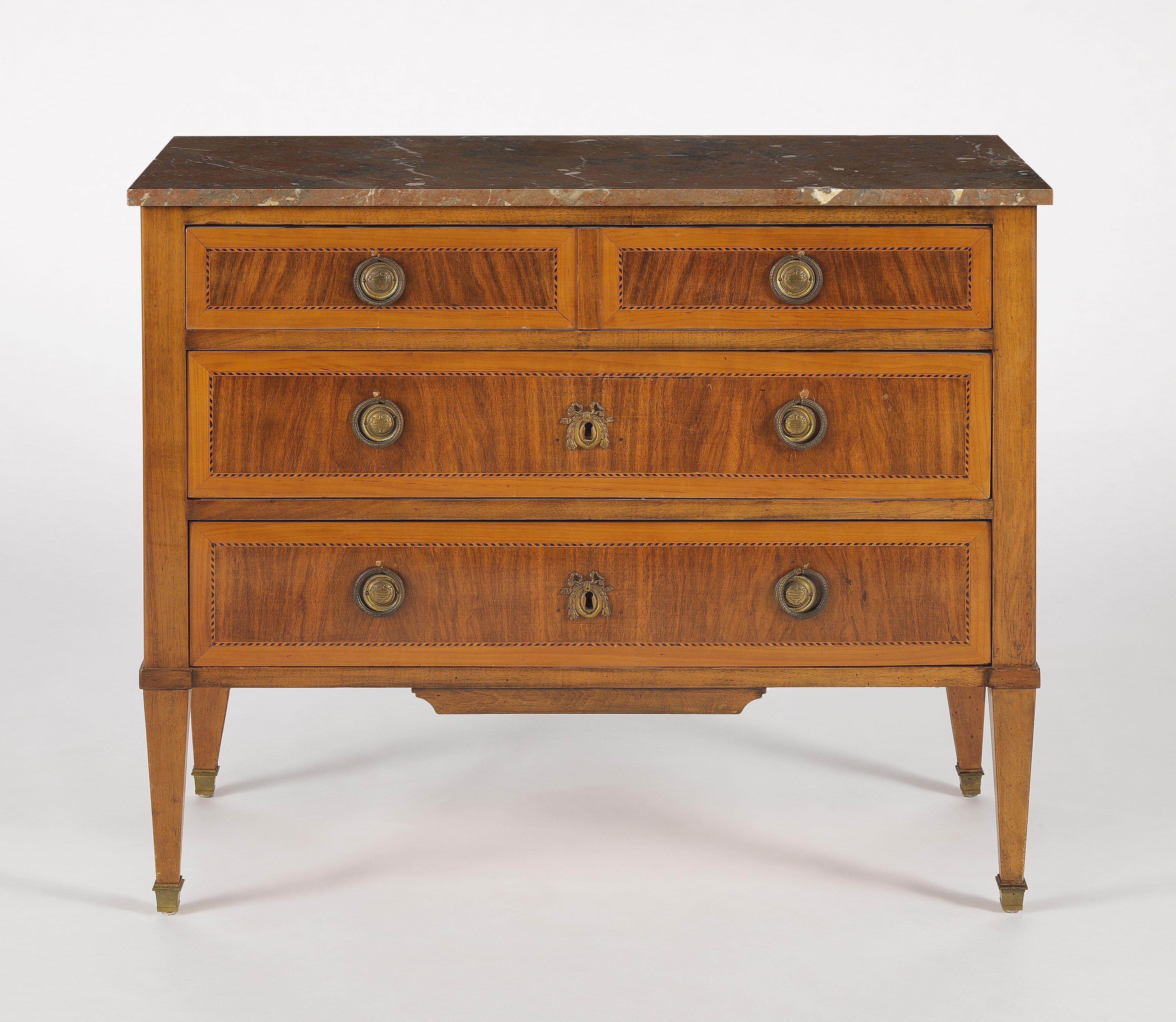 Trois tiroirs, bois de rose et bois de violette, marbre, bronze...