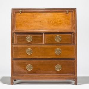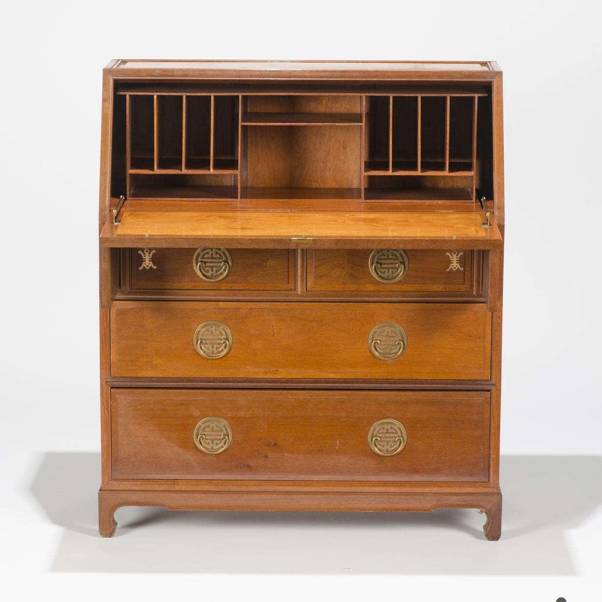 Façade galbée ouvrant par trois tiroirs, marqueterie de bois fru...