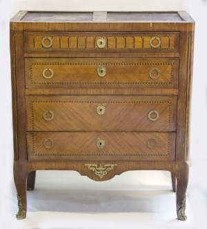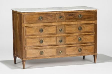 Bois fruitier marqueté en filets, quatre tiroirs, dessus de marb...