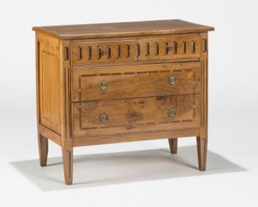 Placage de bois fruitier marqueté en filets, trois tiroirs, Suis...