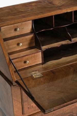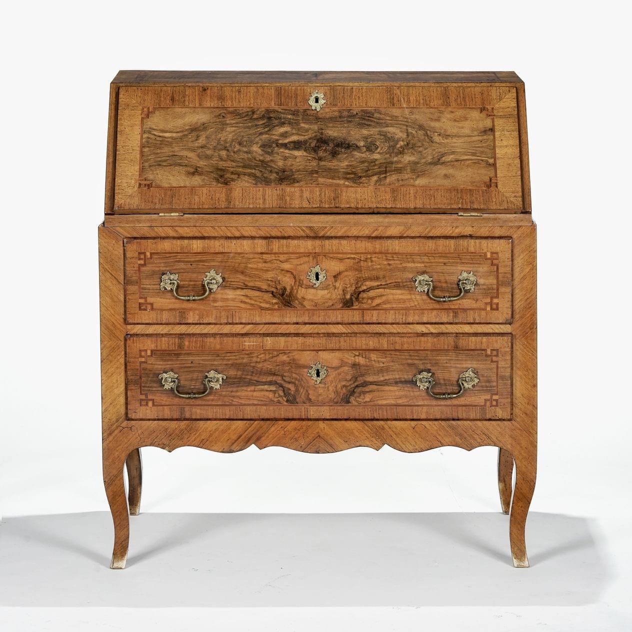 Placage de bois fruitier dans un encadrement de filets, un abattant, deux tiroirs, 105x94x50 cm