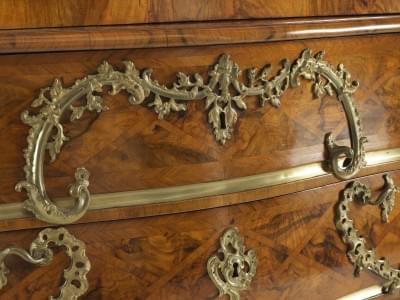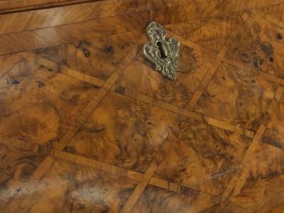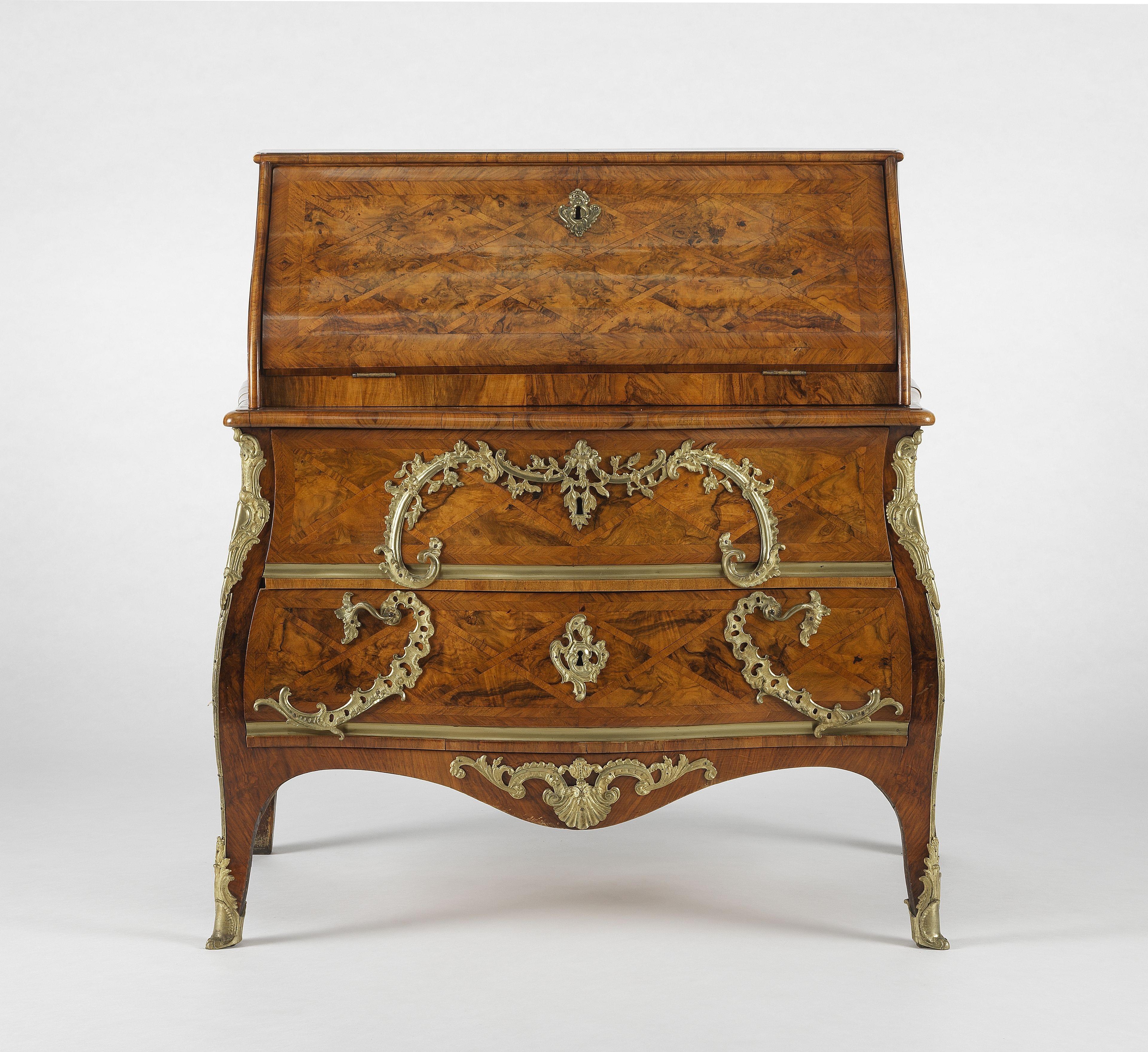 Un abattant et deux tiroirs, noyer et loupe de noyer, bronze doré, 107x96x66 cm. Littérature: Hermann von Fischer, Fonck à Berne, Berne, 2001, Fig.p.105, notre commode est celle reproduite, réf. 179