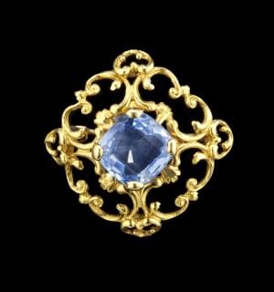 265. Broche ajourée en dentelle centrée d'un saphir de type Ceylan ta...