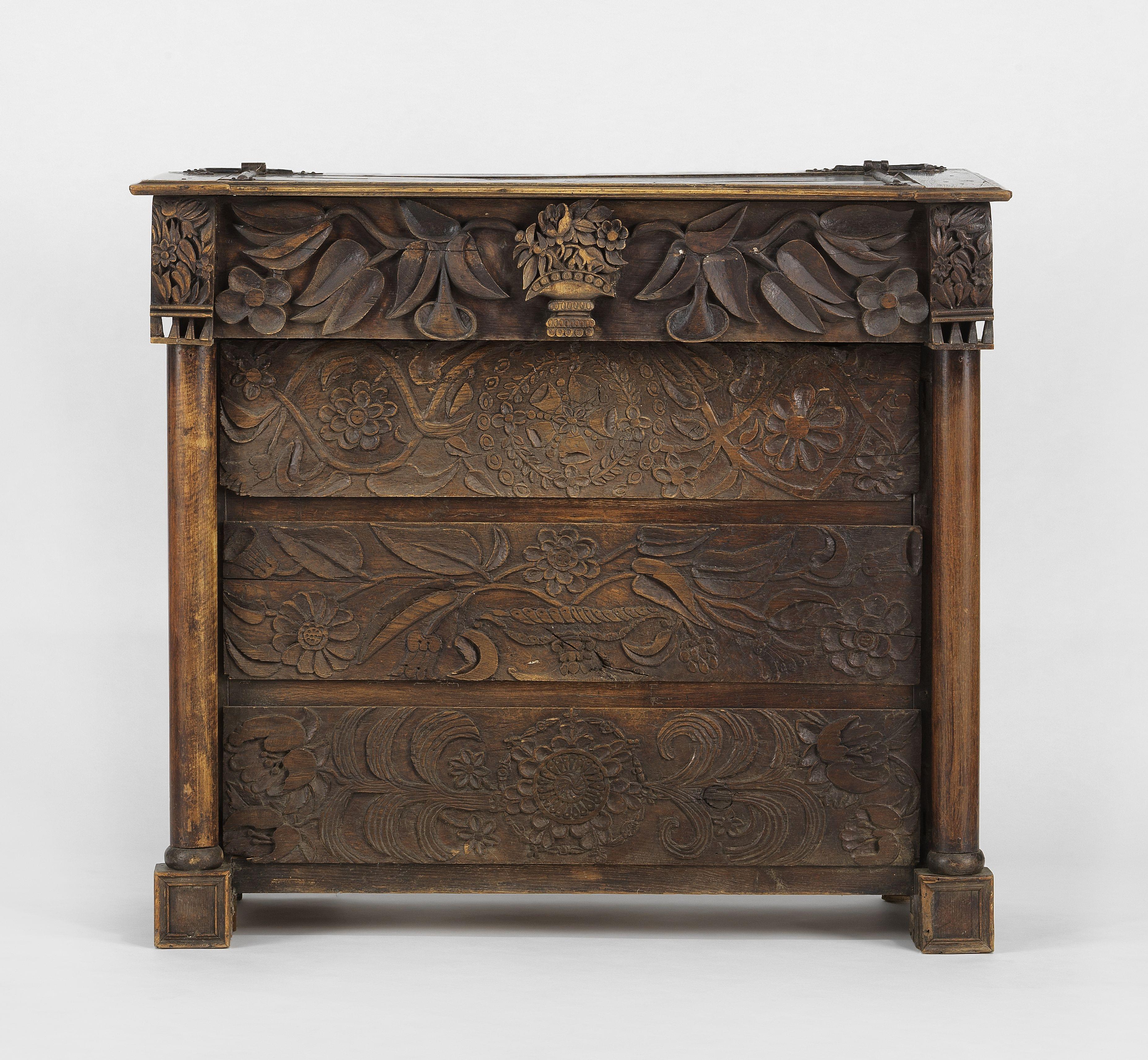 Noyer sculpté à décor végétal, 3 tiroirs, 109x124x58 cm
