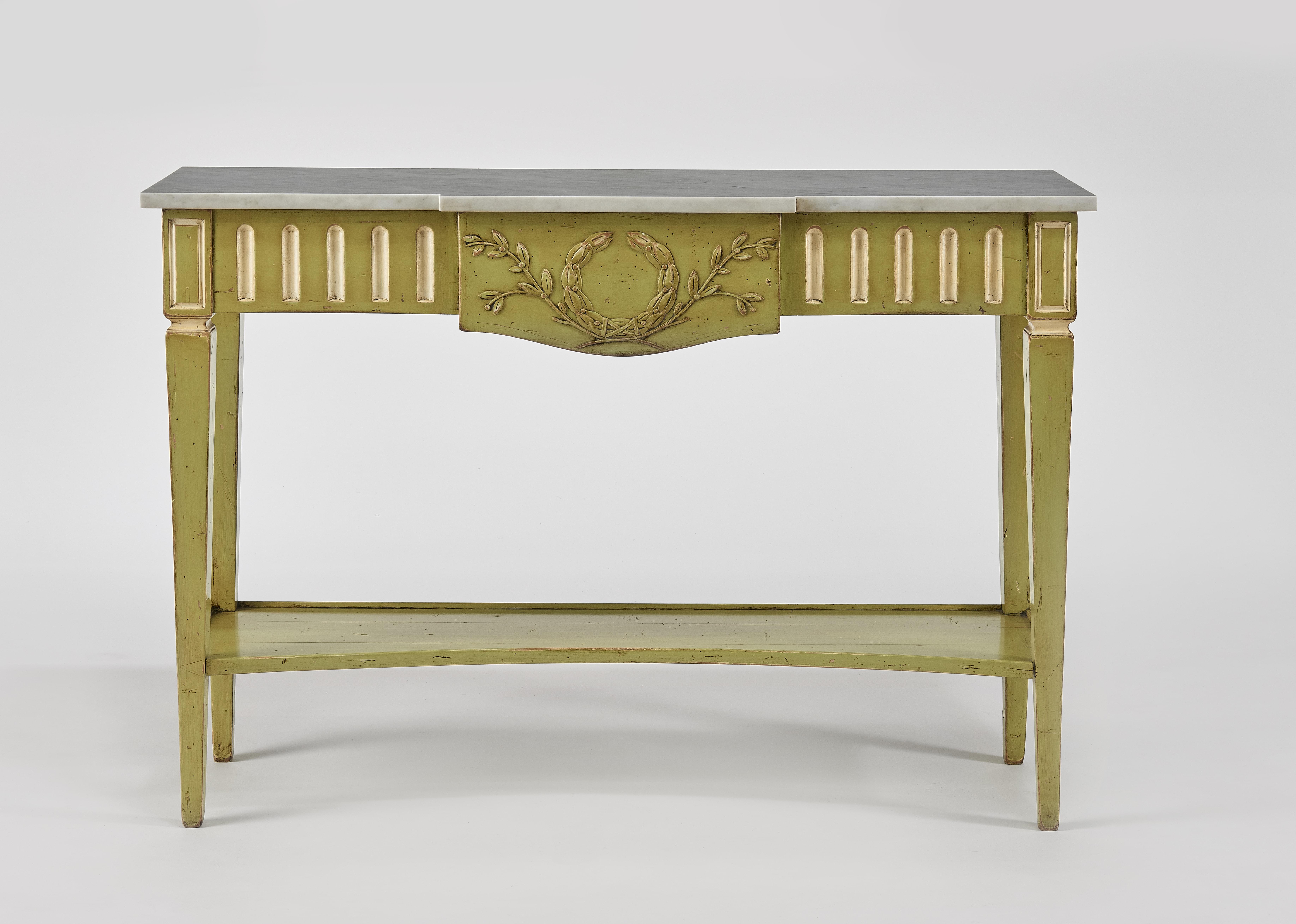 Un tiroir en ceinture, bois peint vert, marbre blanc, 84x117x35 cm
