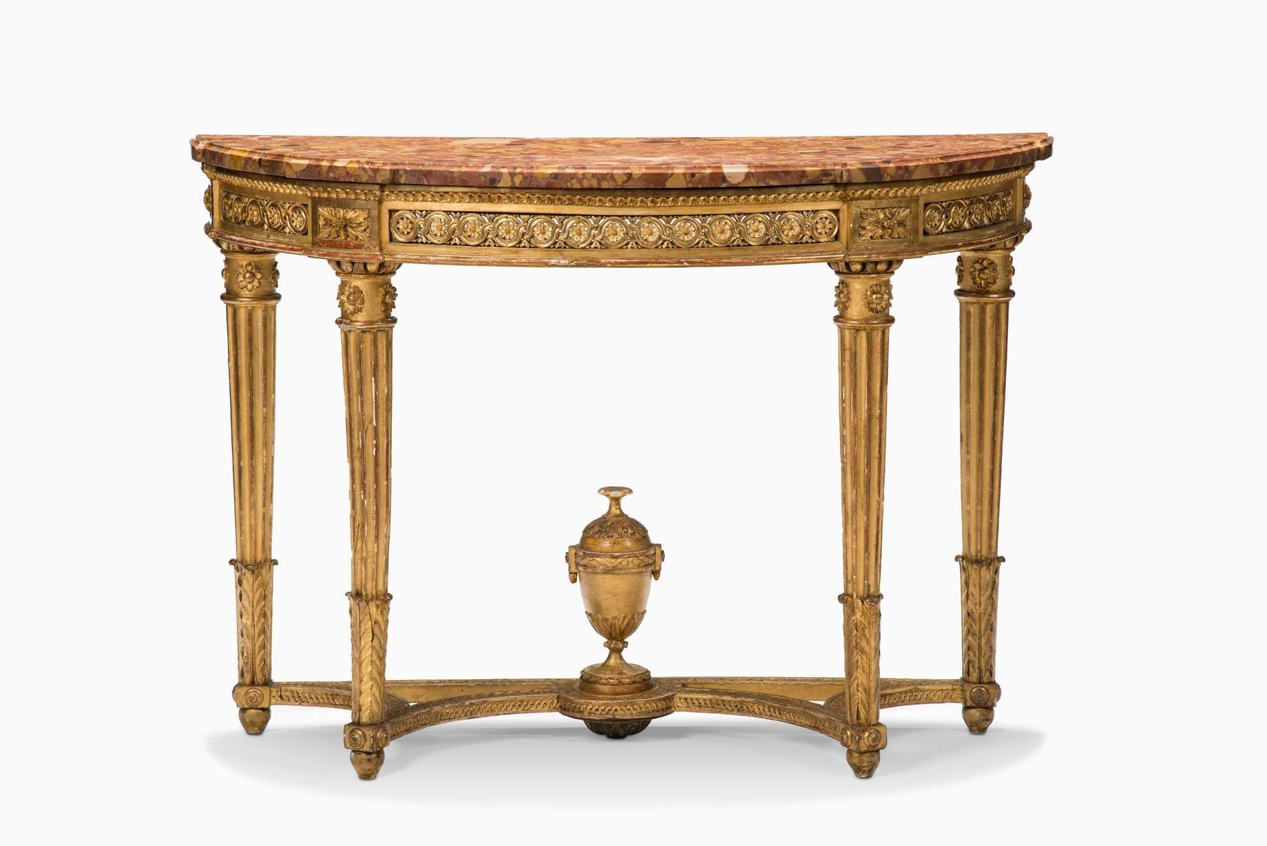 Ceinture ajourée d'entrelacs et fleurettes, entretoise à décor d'un vase à l'antique, bois sculpté doré, marbre brèche d'Alep, 86x121x48 cm