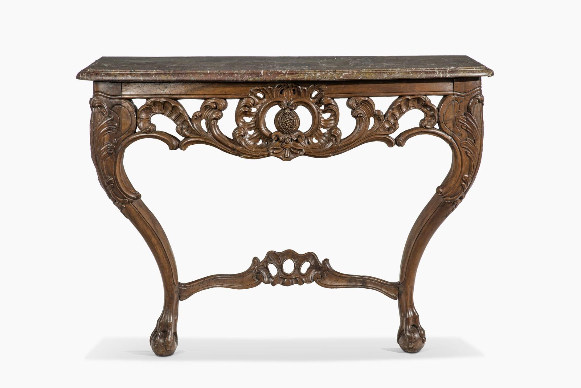 Noyer naturel sculpté, pieds griffes, marbre brèche, 92x131x66 cm
