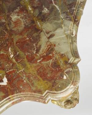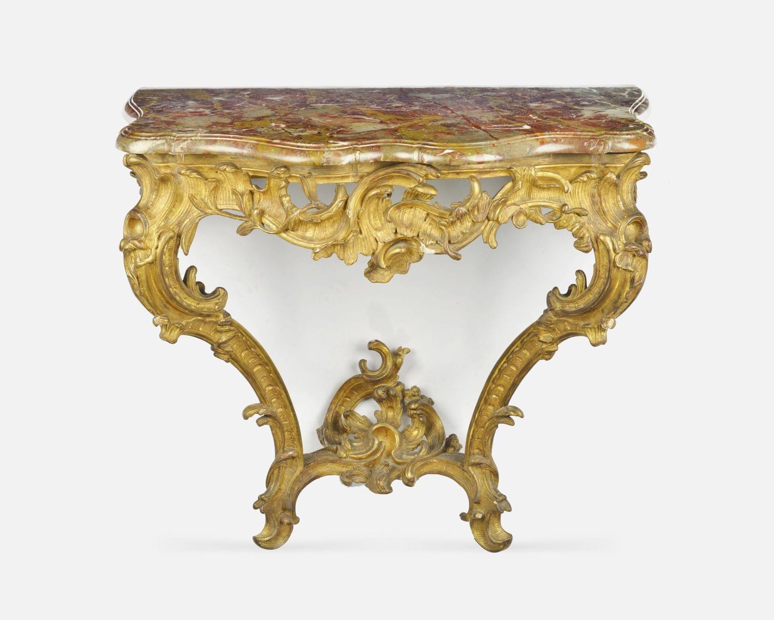 Les deux pieds réunis par une entretoise rocaille, bois sculpté et doré, marbre veiné rouge et brun, 81x97x53 cm