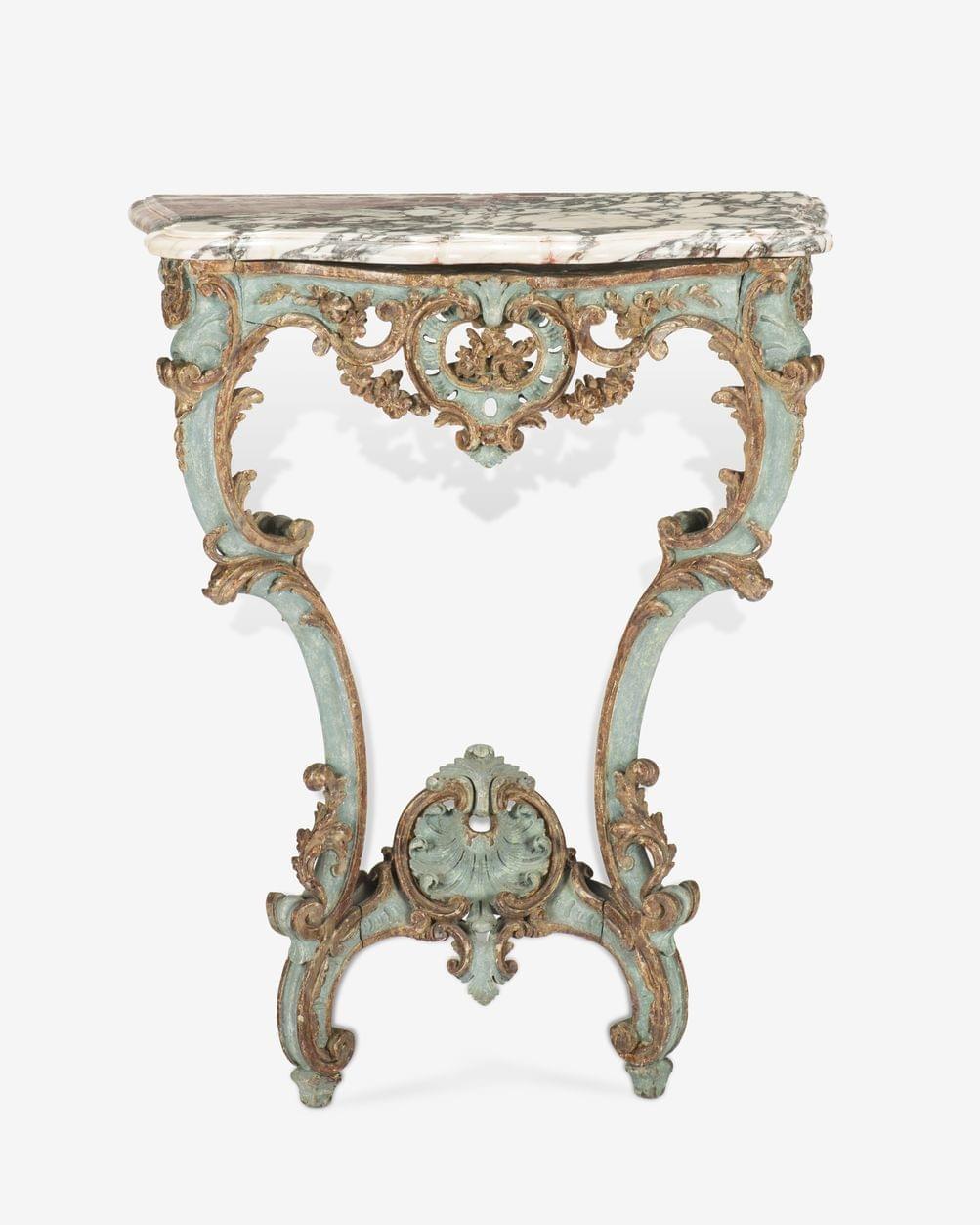 Bois sculpté laqué bleu rechampi or, marbre brèche, 92x73x44,5 cm