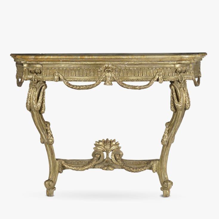 Bois sculpté et doré à décor de guirlandes de lauriers et enroulements, marbre blanc, 92x132x57 cm