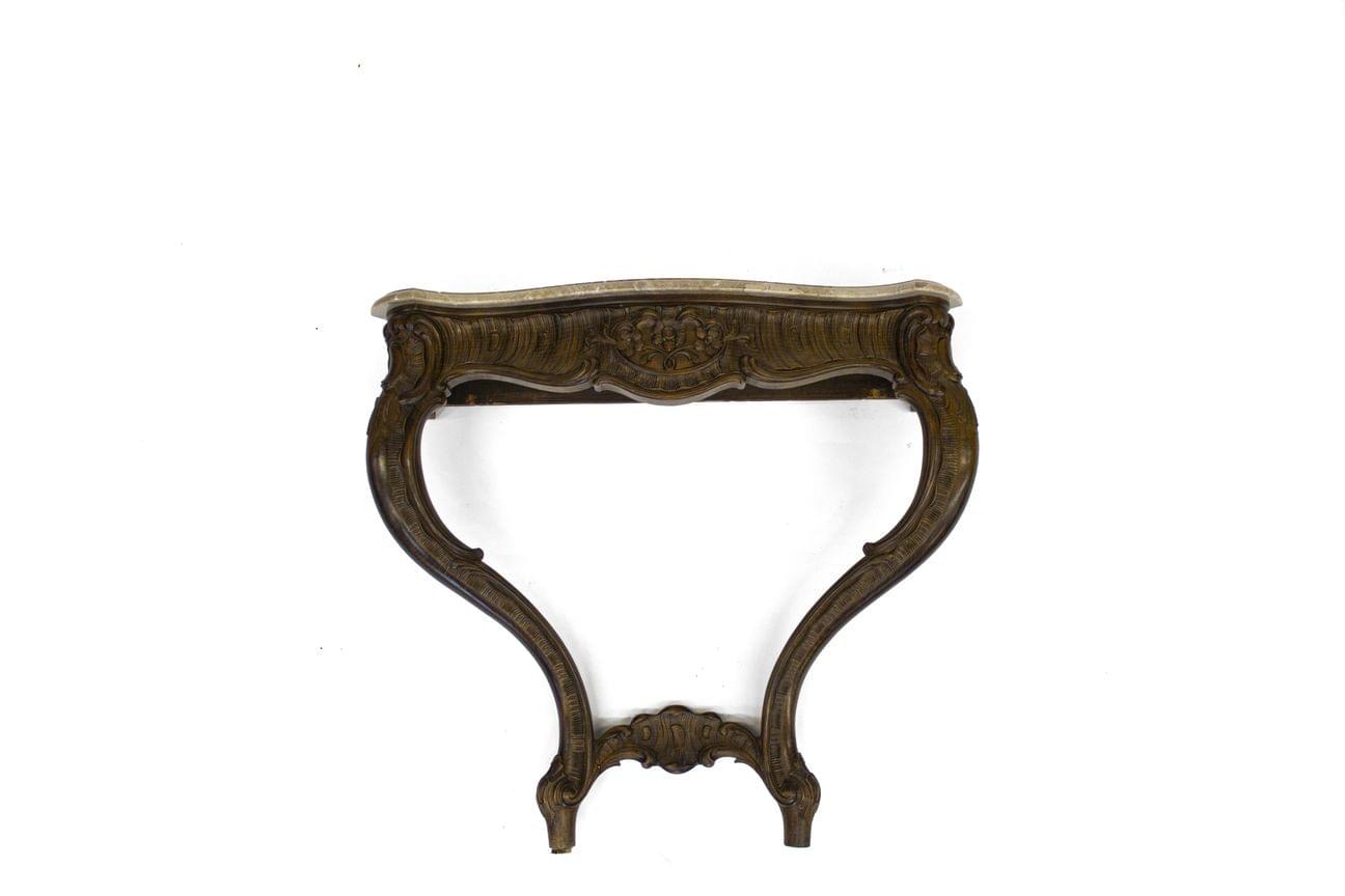 Bois sculpté et marbre gris clair, 95x90x25 et 128x73 cm.