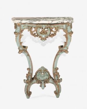 Bois sculpté laqué bleu rechampi or, marbre brèche, 92x73x44,5 c...