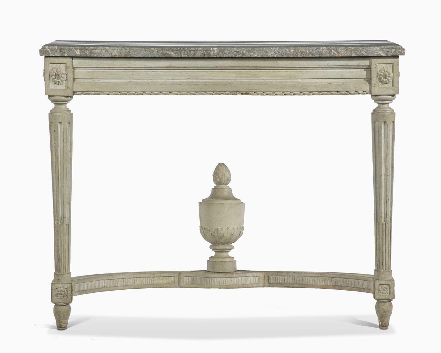 Entretoise à décor d'un vase, bois laqué gris, marbre gris, 83x105x50 cm