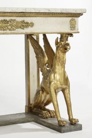 Montants en griffons ailés, entablement postérieur orné de bronzes ciselés, bois sculpté, doré, peint faux marbre gris et blanc, marbre blanc, Italie, début XIXe s, 89x152x65 cm