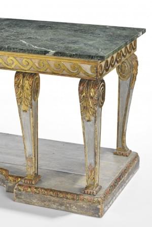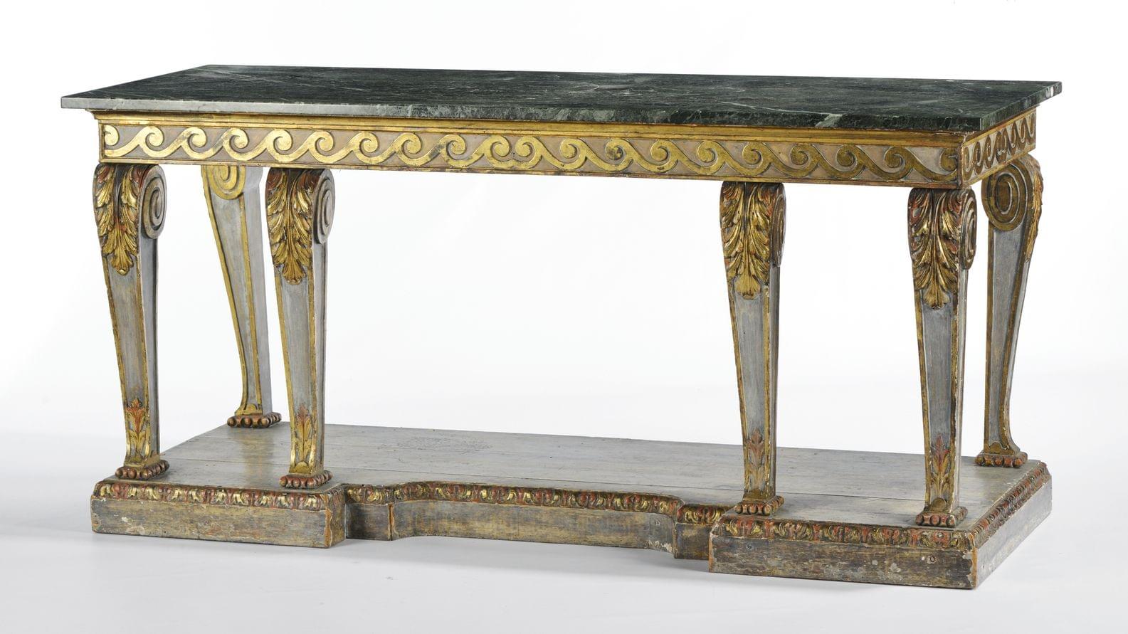 Reposant sur six pieds en enroulement d'acanthes et entablement à frise de postes, base en plinthe, bois laqué gris rechampi or et marbre vert de mer, 87x183x99 cm