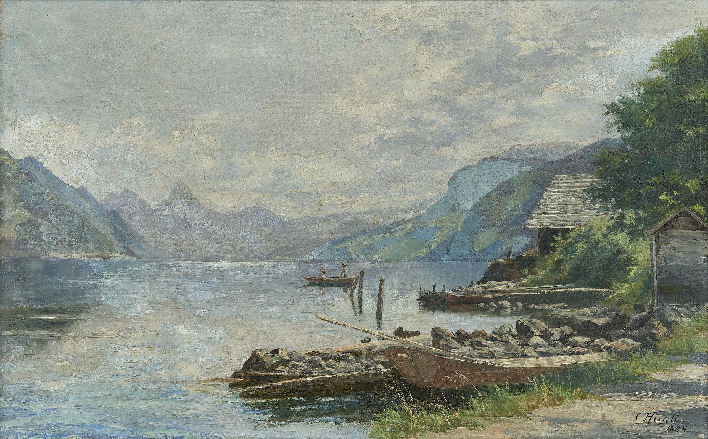 Lac de Suisse centrale, huile sur toile, signée et datée 1884, 34x54 cm