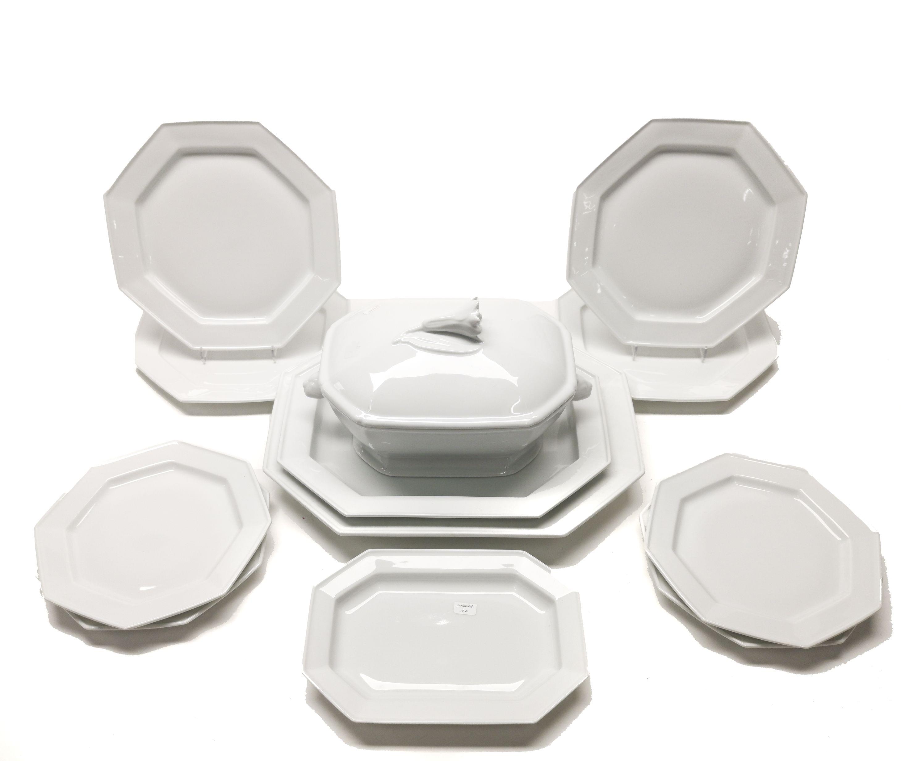 Limoges, porcelaine, comprenant: 5 assiettes à dîner, 5 à entremets, 5 plats, 1 légumier (16p). Lot vendu au profit de l'association Frères de nos Frères