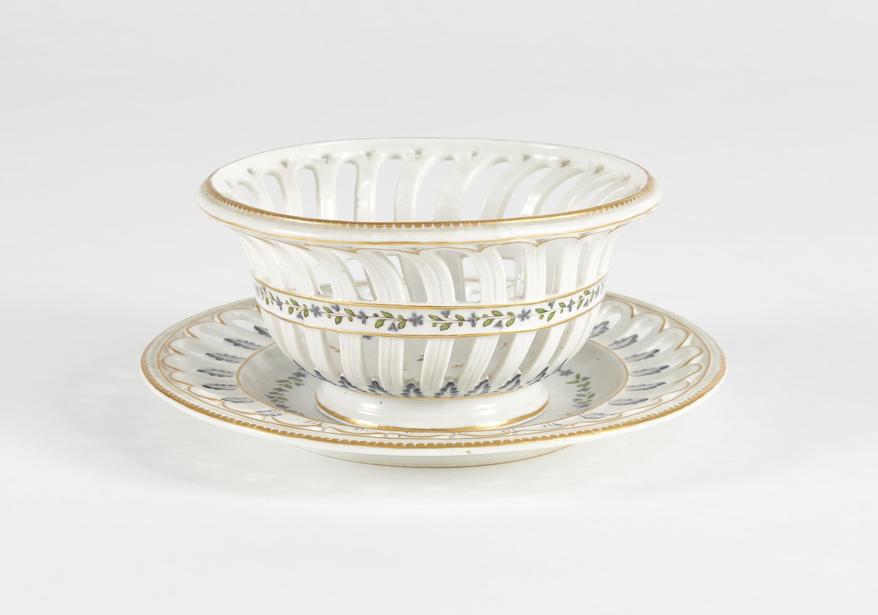 1002. Corbeille ronde ajourée sur présentoir à décor de bleuets,