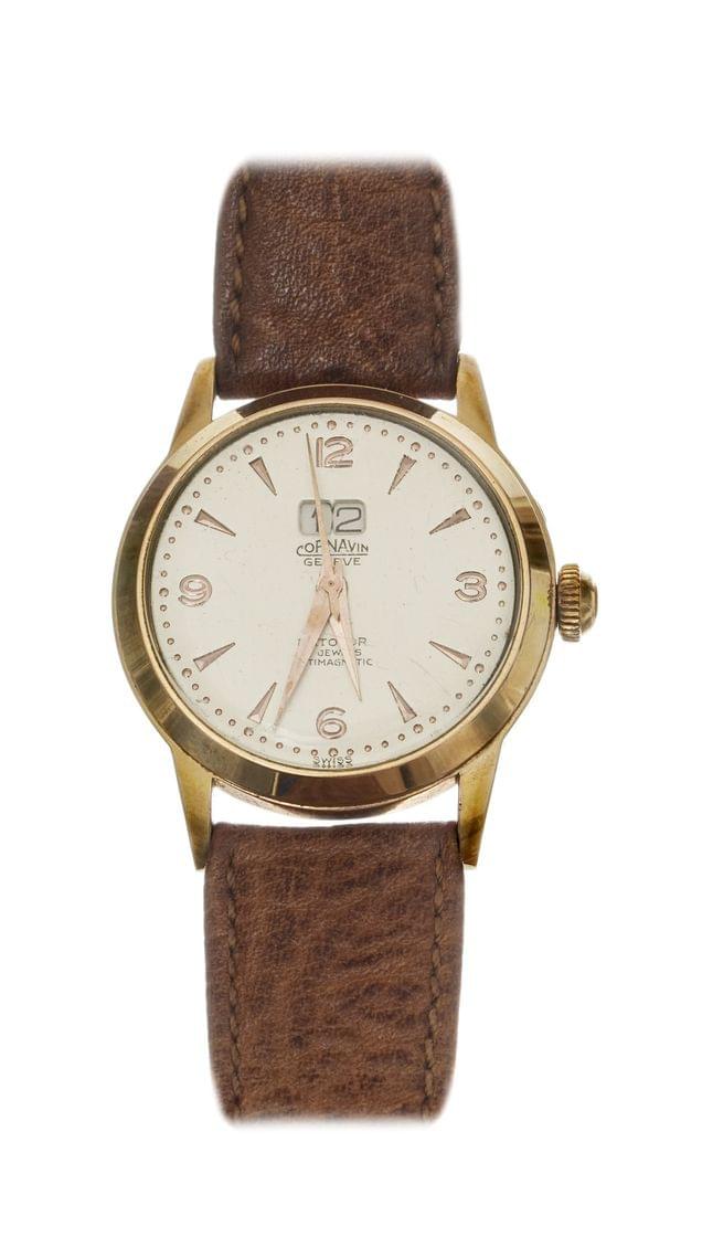 Cadran gris, aiguilles, chiffres arabes et index à points dorés, date à guichet à 12h, plaqué or et acier, D 26 mm