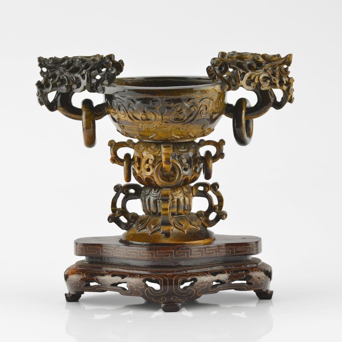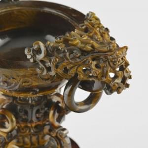 Œil de tigre sculpté et ajouré, anses à tête de dragon, anneaux, Chine, XXe s, H 14 cm