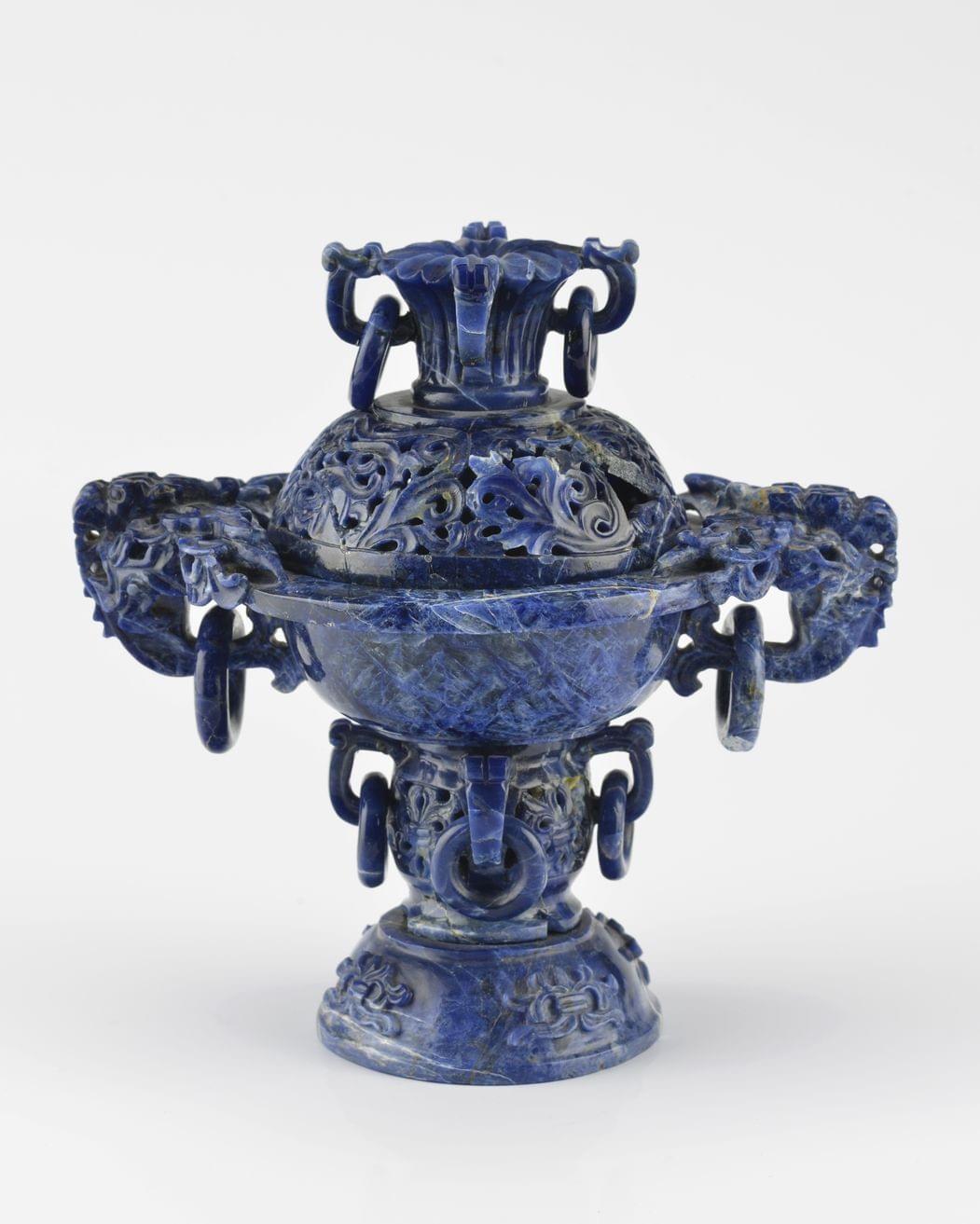 Sodalite sculptée et ajourée, anses à têtes de dragons, Chine, Xxe s, H 20 cm