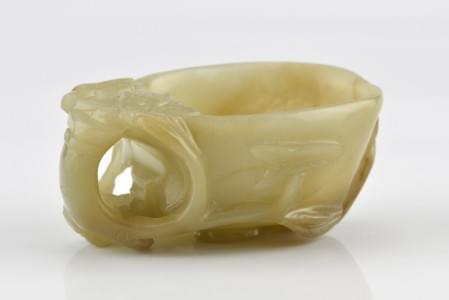 Jade, Néphrite, inclusions brunes à décor de branches de fleurs en relief, L 9 cm