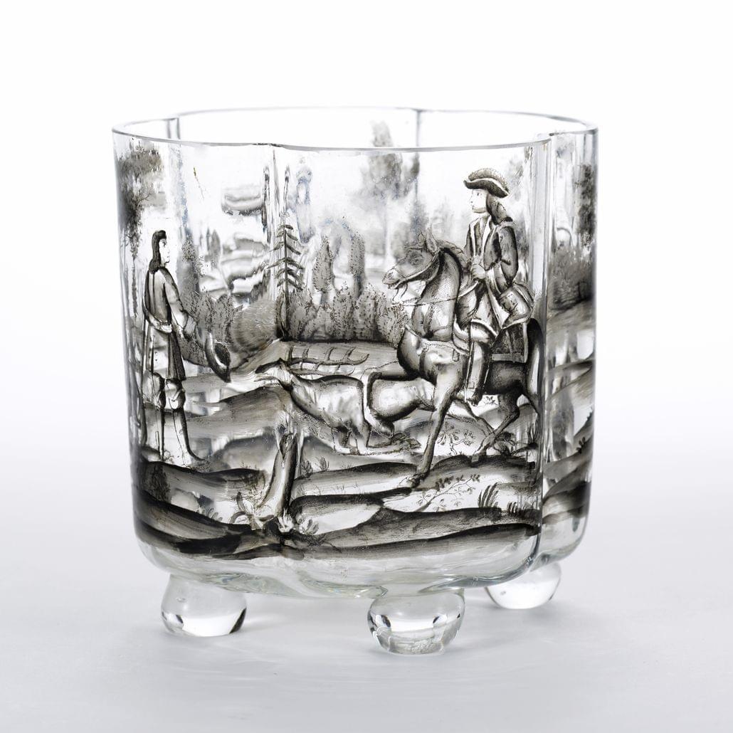 3165. Coupe quadrilobée à décor peint en grisaille de scènes de chasse