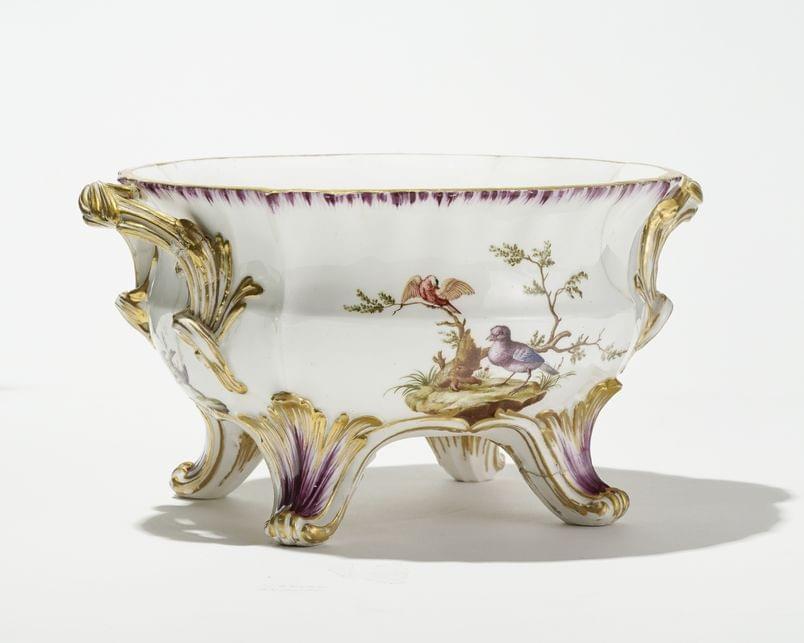 217. Coupe quadripode à anses en acanthes dorées et bordure pourpre, décor d'oiseaux et branchages,
