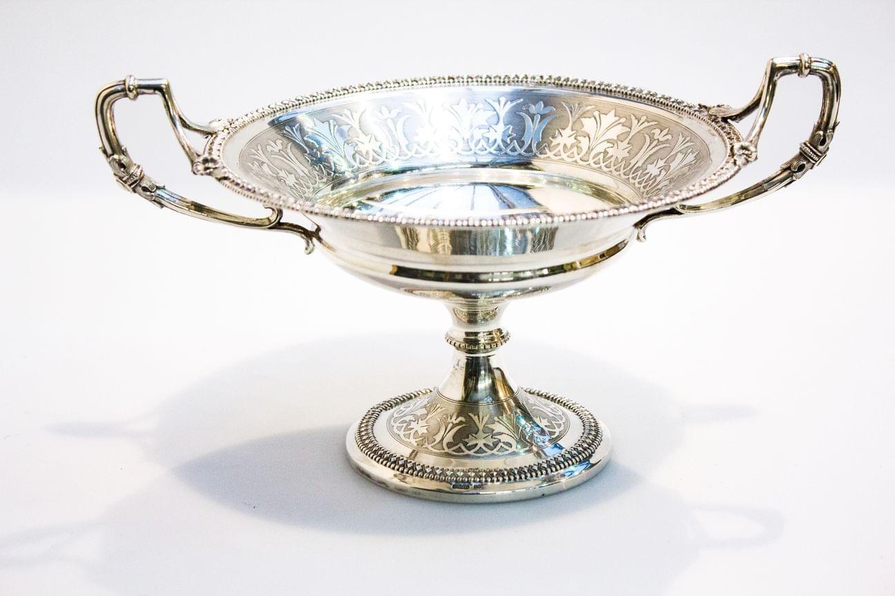 159. Coupe carrée sur piédouche à bordure de palmettes et motif de go...