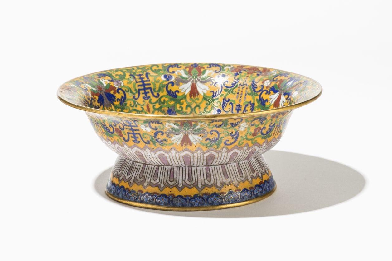 Cuivre et émaux cloisonnés à décor de végétaux et caractères, Chine, dynastie Qing (1644-1911), D 23 cm