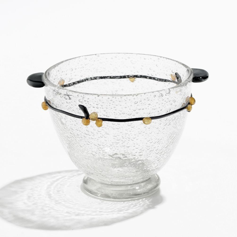 Verre bullé à décor appliqué d'une tige noire à baies miel, deux anses demi-lune noires, H 10,5 cm