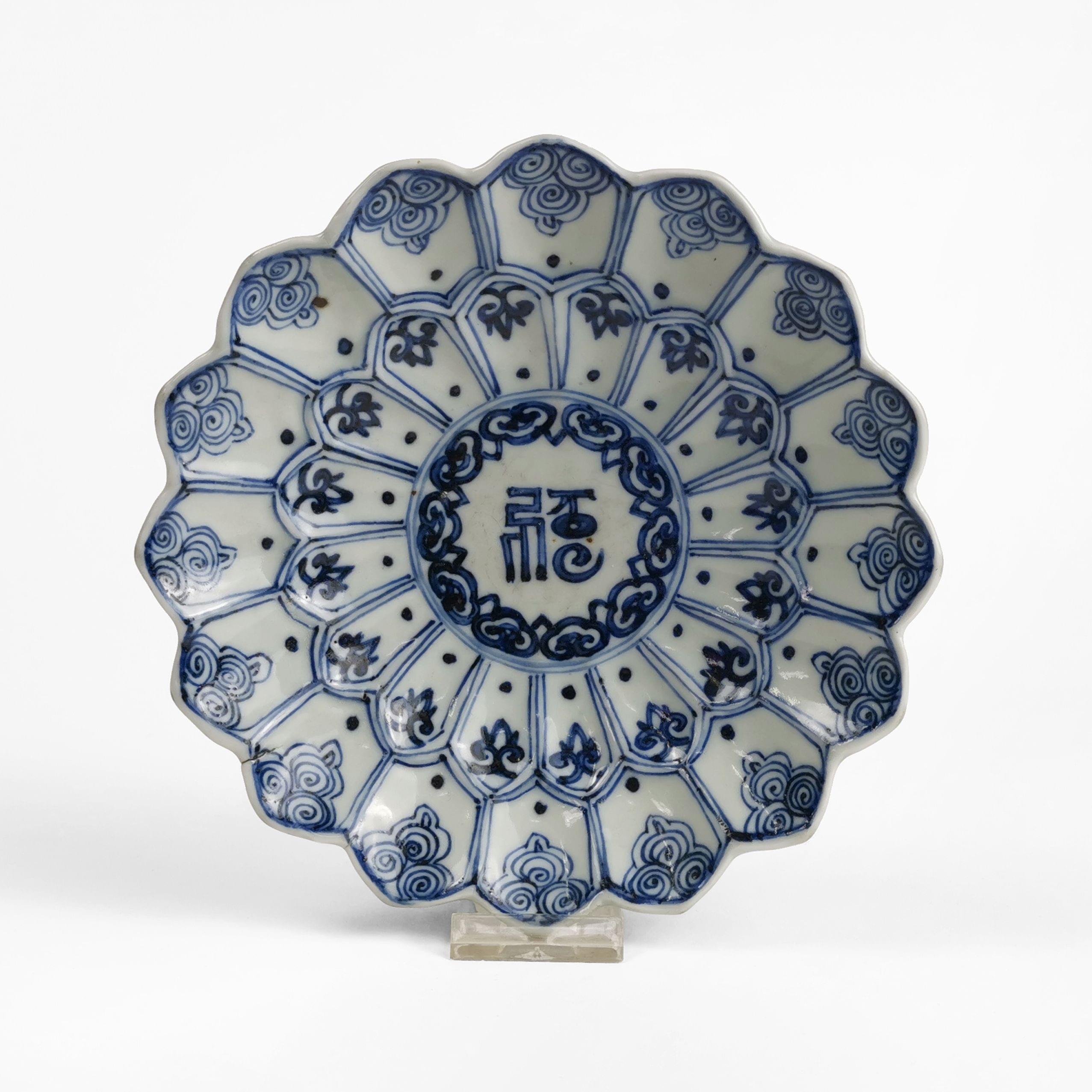 Porcelaine émaillée bleu blanc à décor de caractères et fleurs, D 18 cm