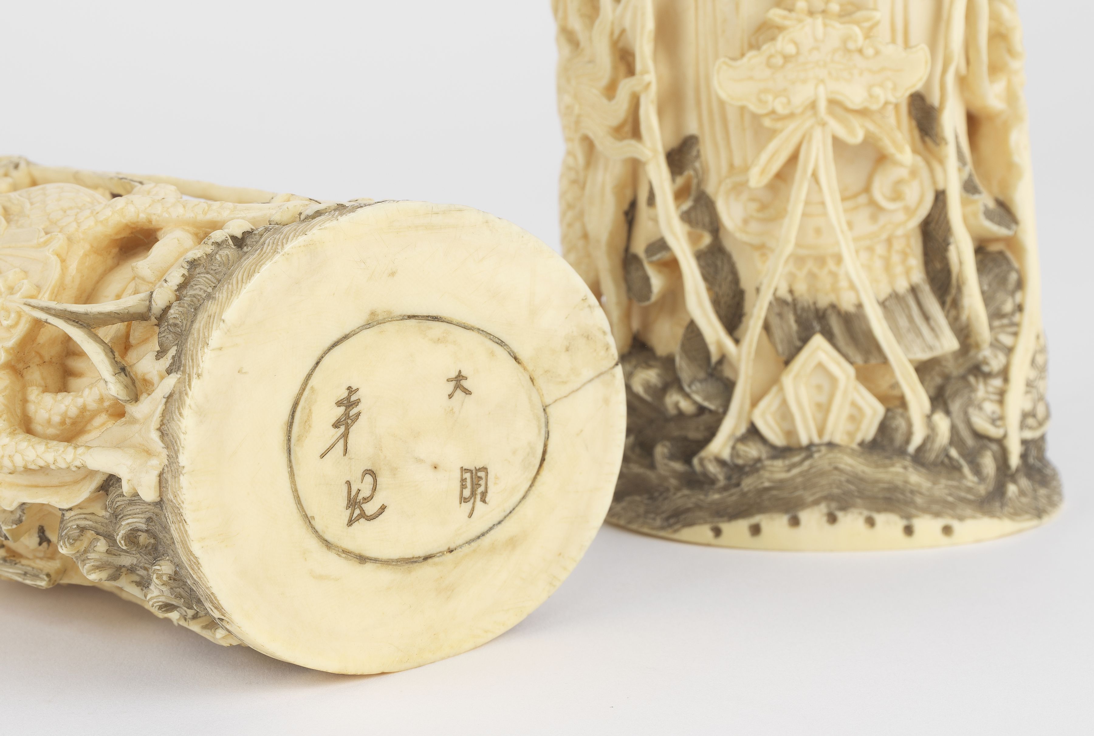 Pierre silicieuse blanche sculptée de quatre têtes de taureaux,...
