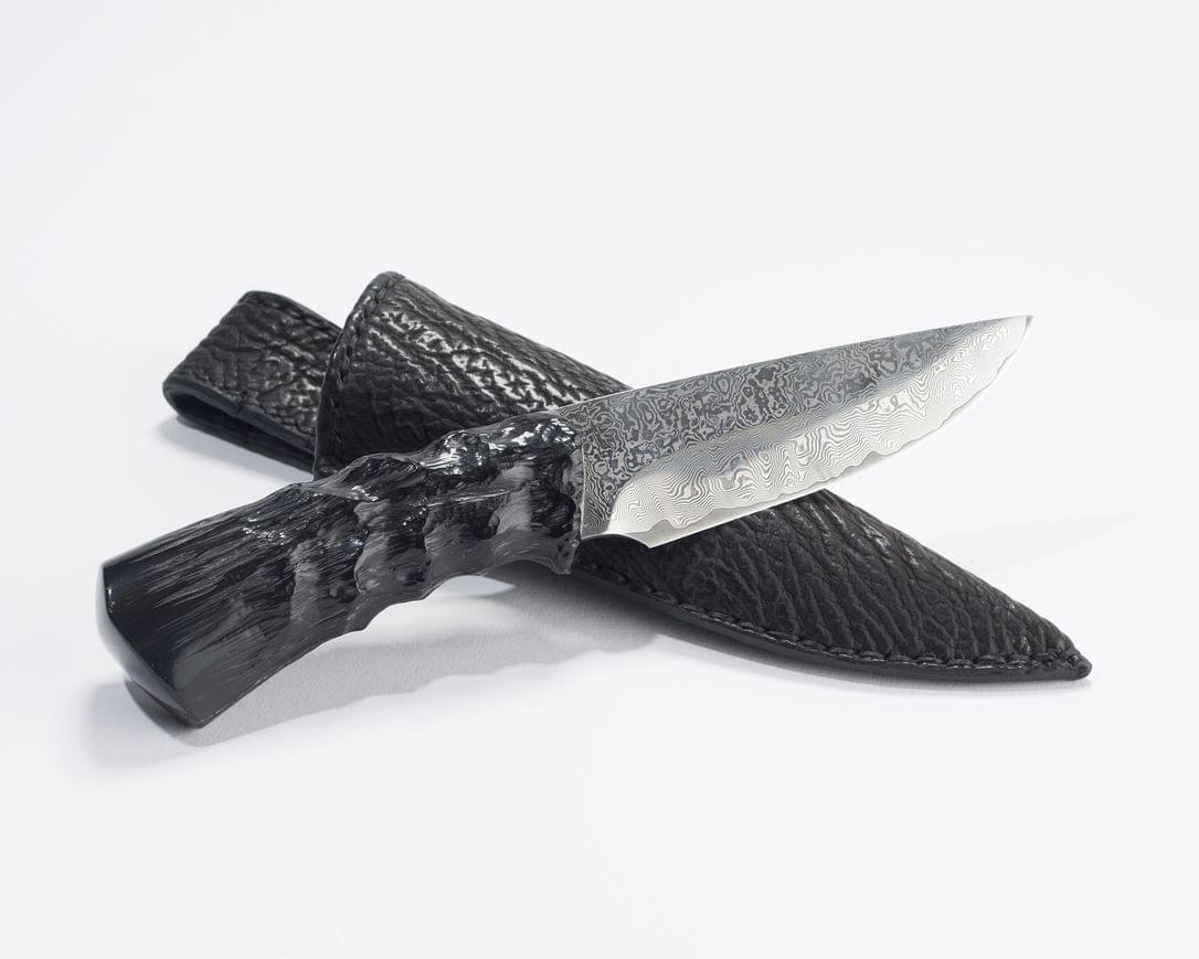Lame en acier damassé, manche en corne sculptée, L 23 cm