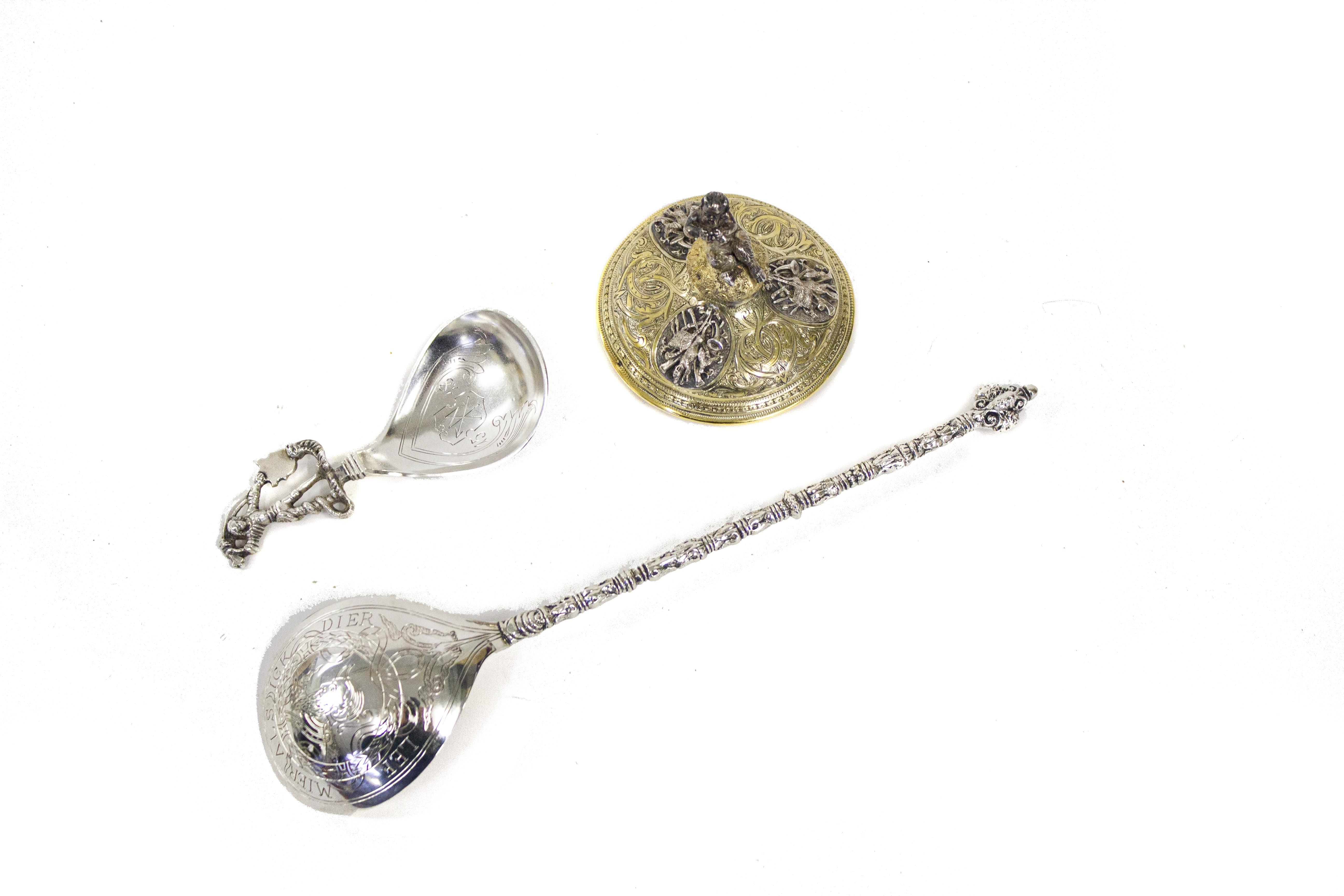 3460. Couvercle sommé d'un dieu Pan, cuillère à épices de baptème et grande cuillère de style nordique