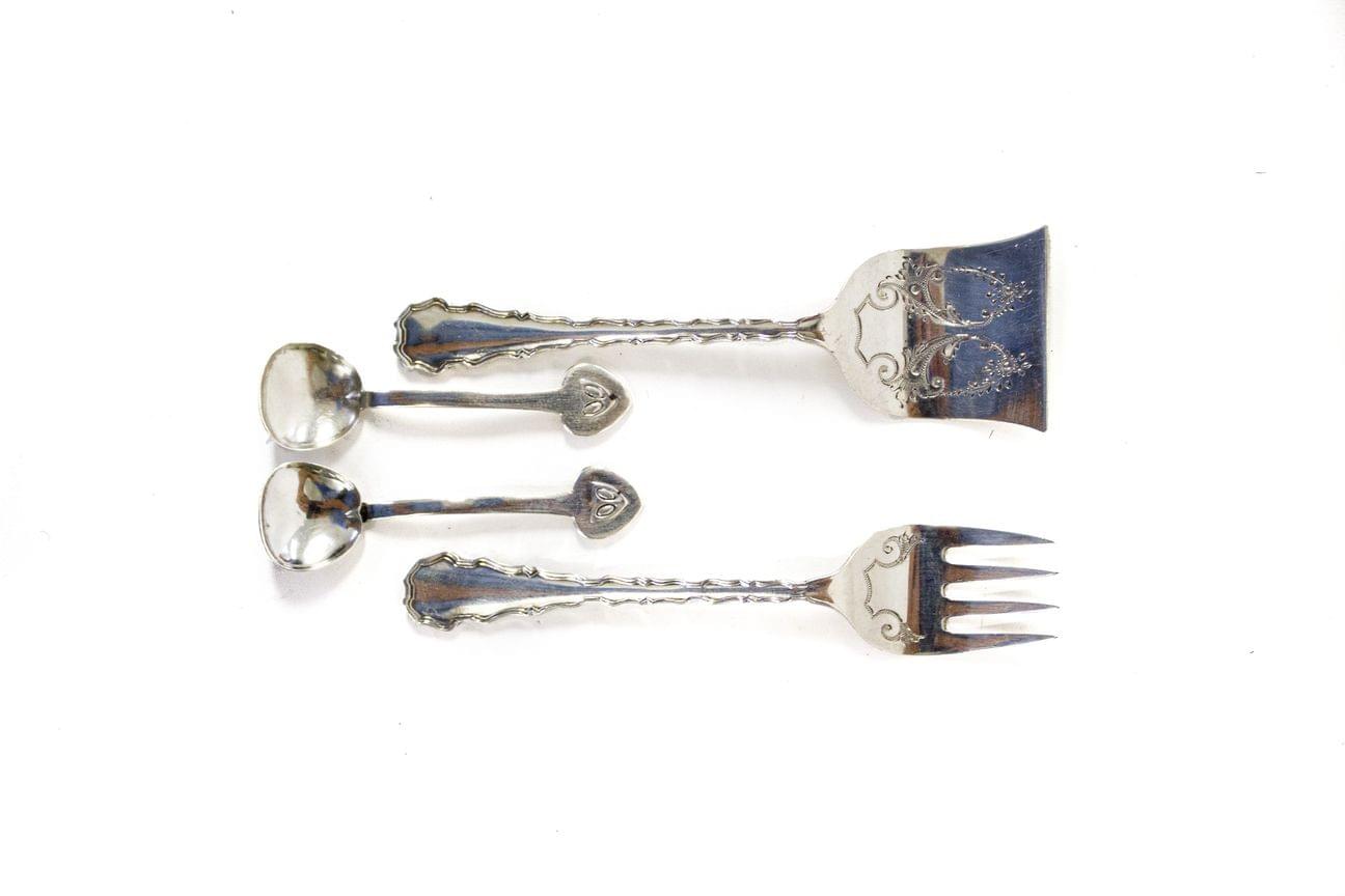 3393. Couverts de service à migniardises et paire de cuillères de salerons