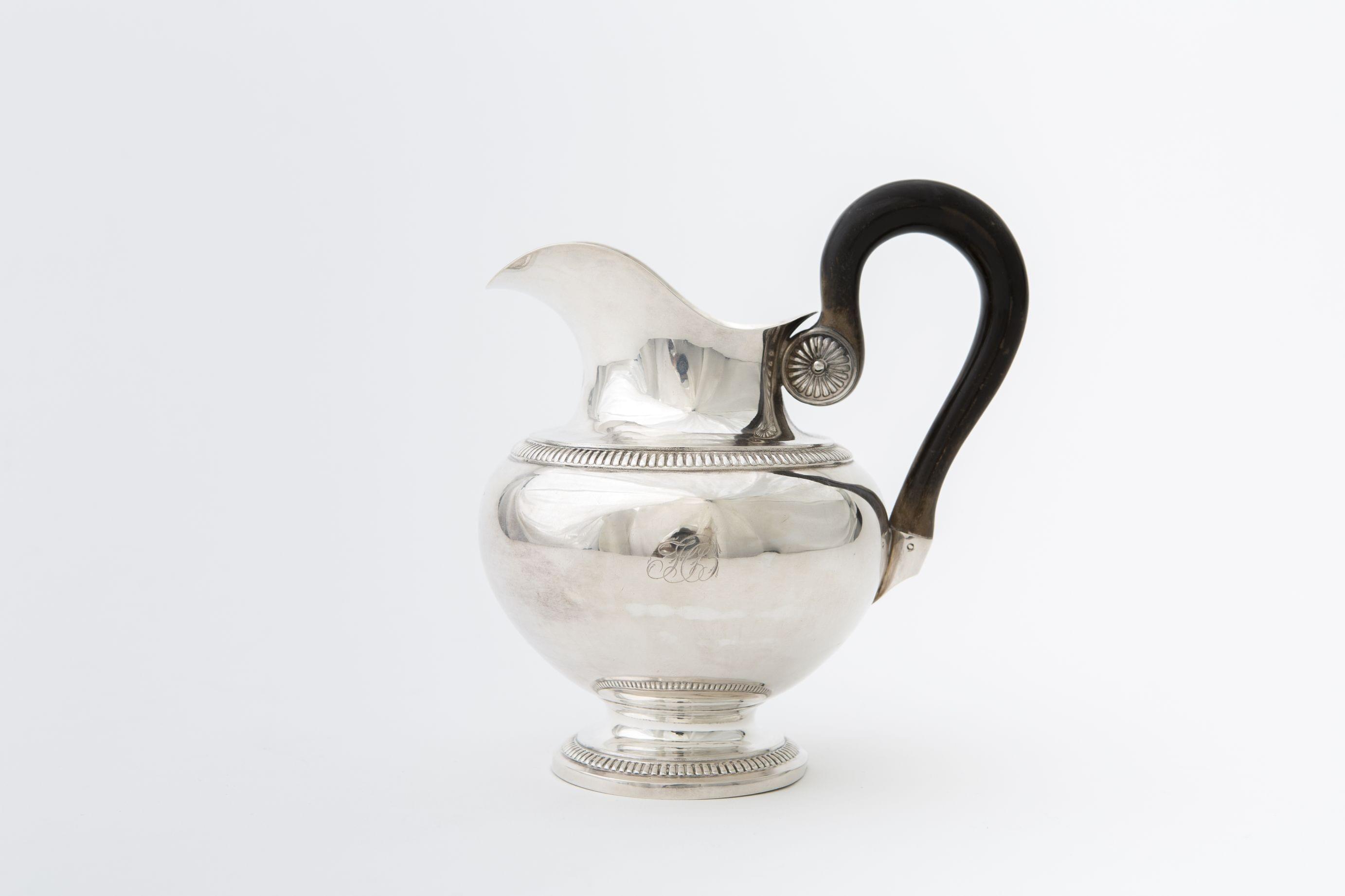 592. Crémier néoclassique à décor de mascarons en applique et anse ac...