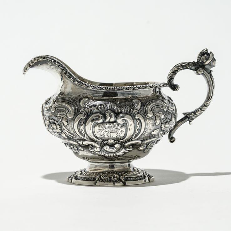 208. Crémier d'époque George III à motif de fleurs et volutes, anses sommées d'une tête à l'antique